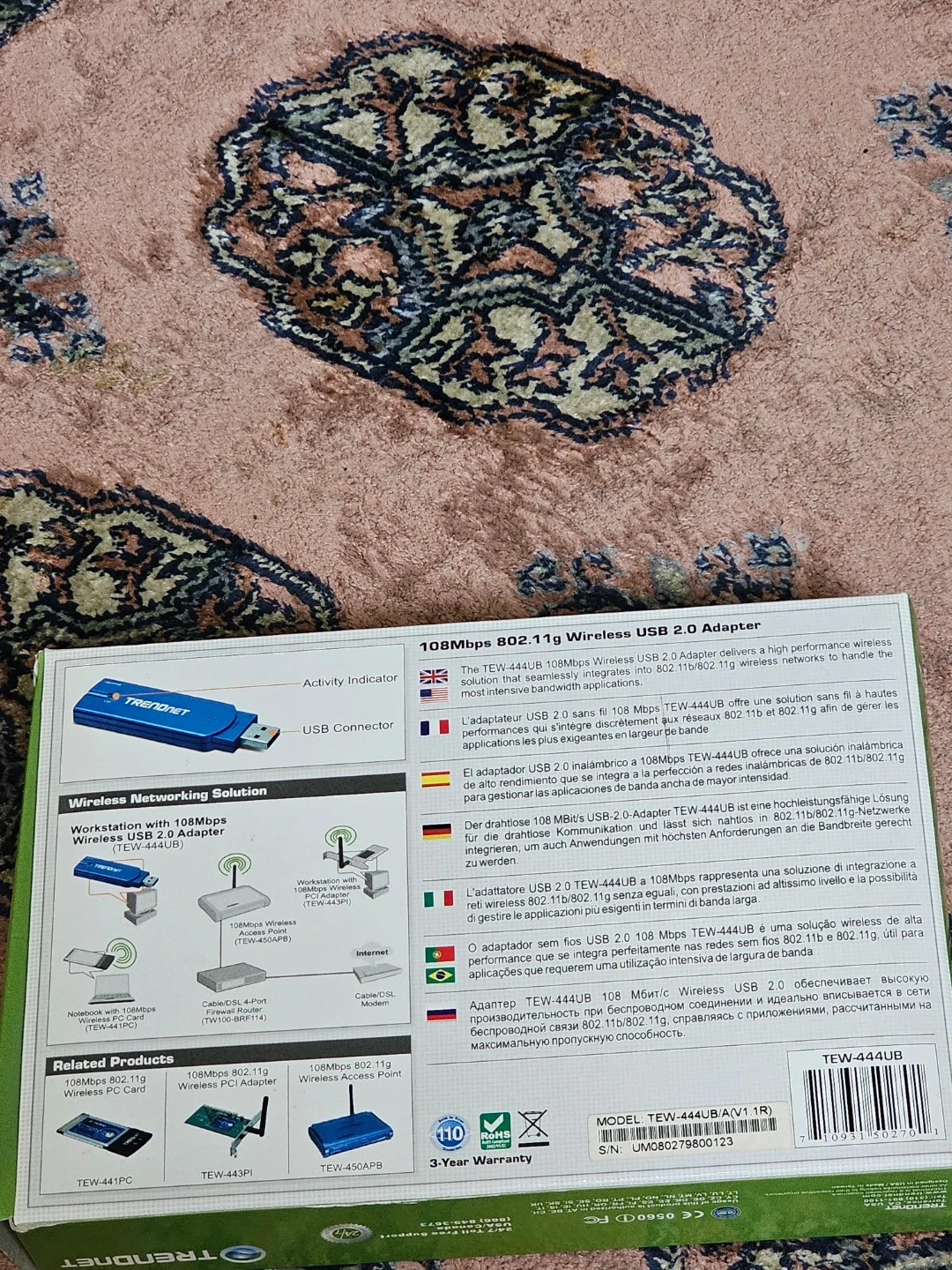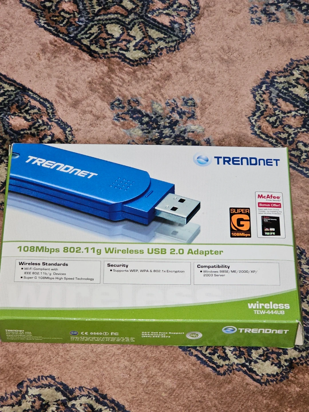 Selling a brand new TRENDnet TEW-444UB Wireless USB 2.0 Adapter, still in its original box! This adapter supports 108Mbps 802.11g wireless connectivity, making it perfect for older devices. It's compatible with Windows 98SE, ME, 2000, XP, and 2003 Server. The box includes the adapter and all original components.