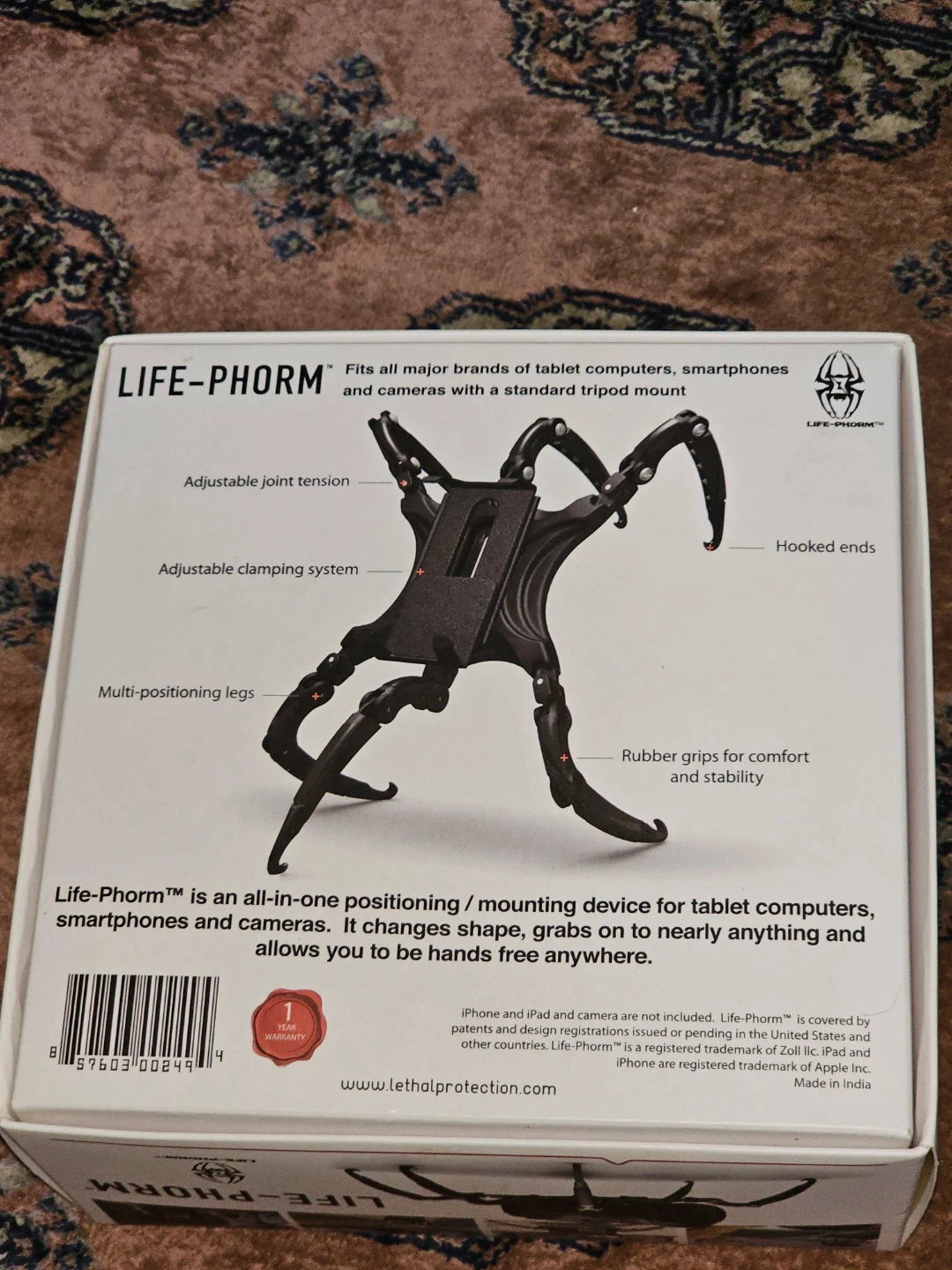 Selling a LIFE-PHORM all-in-one mounting device! It fits all major brands of tablet computers, smartphones, and cameras with a standard tripod mount. It features adjustable joint tension, an adjustable clamping system, multi-positioning legs, and hooked ends. It also has rubber grips for comfort and stability. It's an all-in-one positioning/mounting device for tablet computers, smartphones, and cameras. It changes shape, grabs on to nearly anything, and allows you to be hands-free anywhere