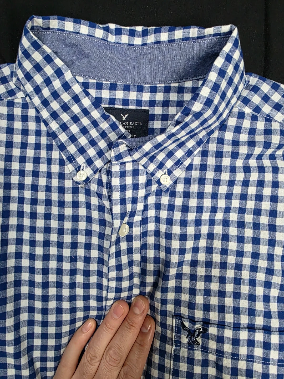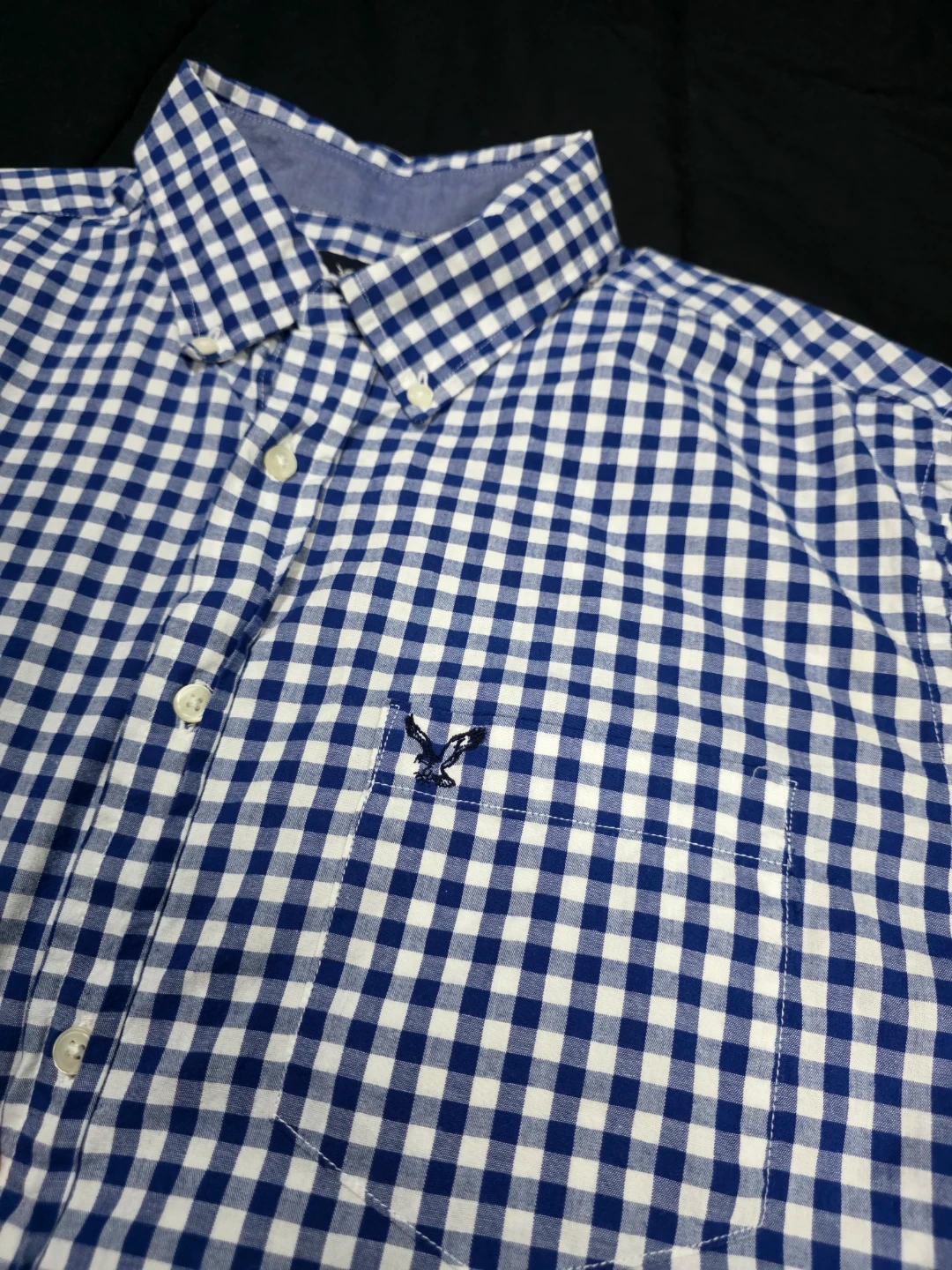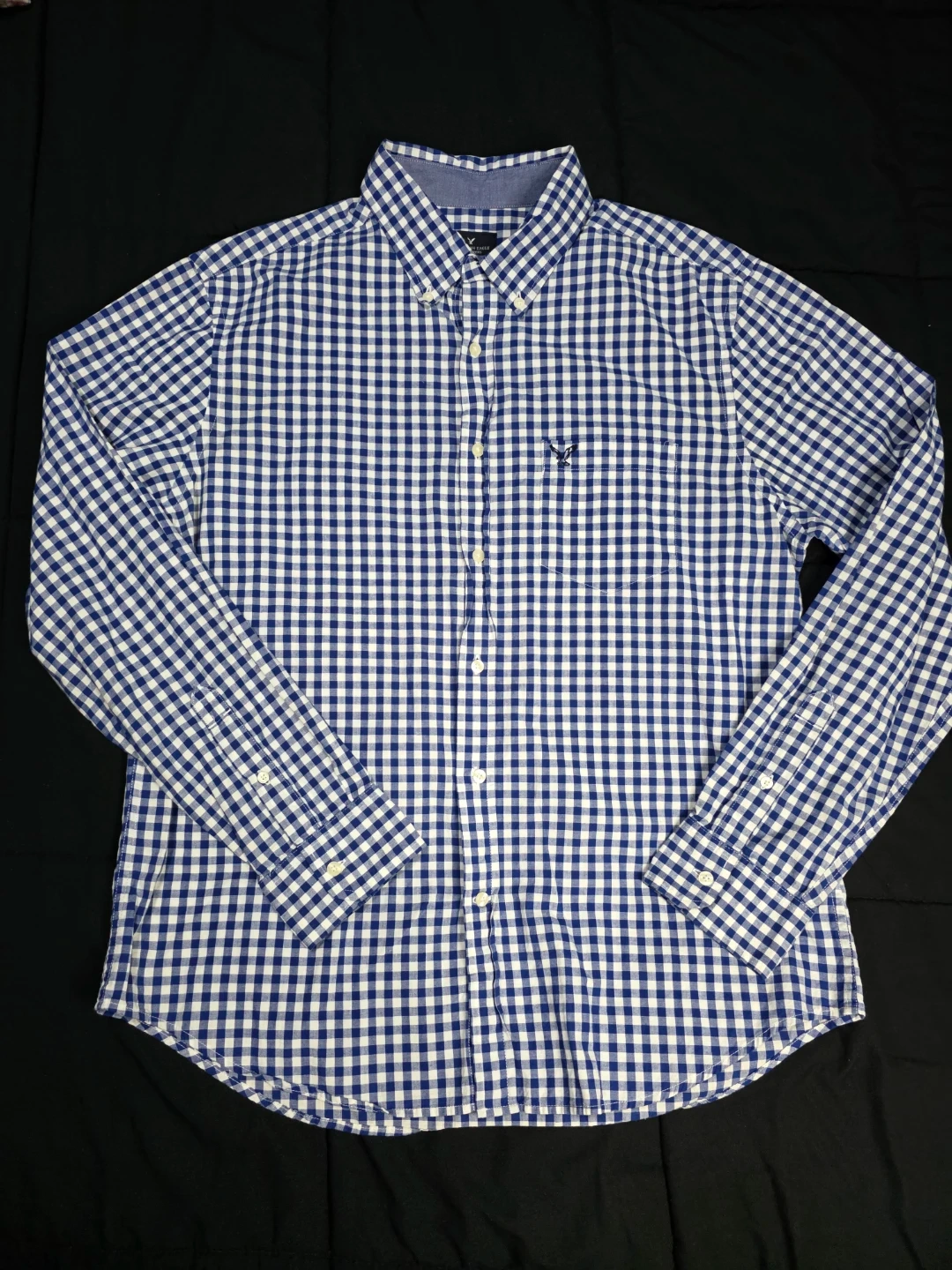 Here's a excellent used American Eagle button-down shirt. It features a classic blue and white gingham pattern, perfect for a casual or semi-formal look. The shirt has a front pocket and the American Eagle logo embroidered on it. It's in great condition and ready for a new owner!