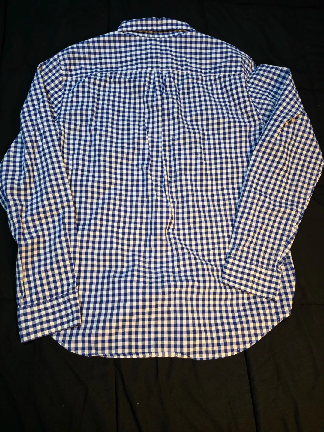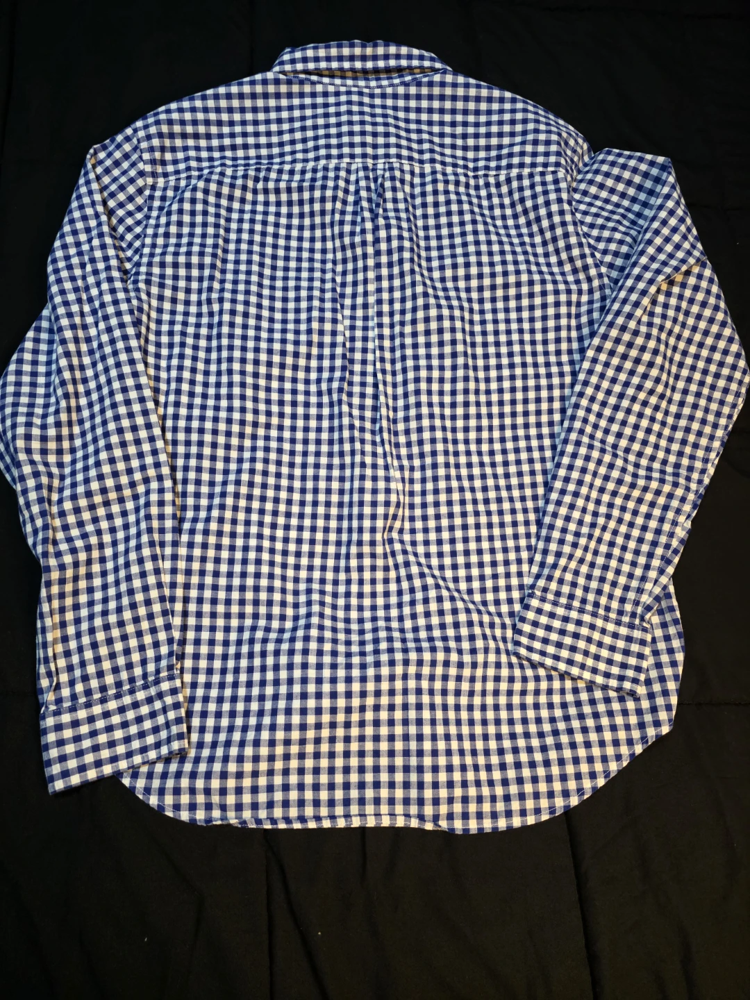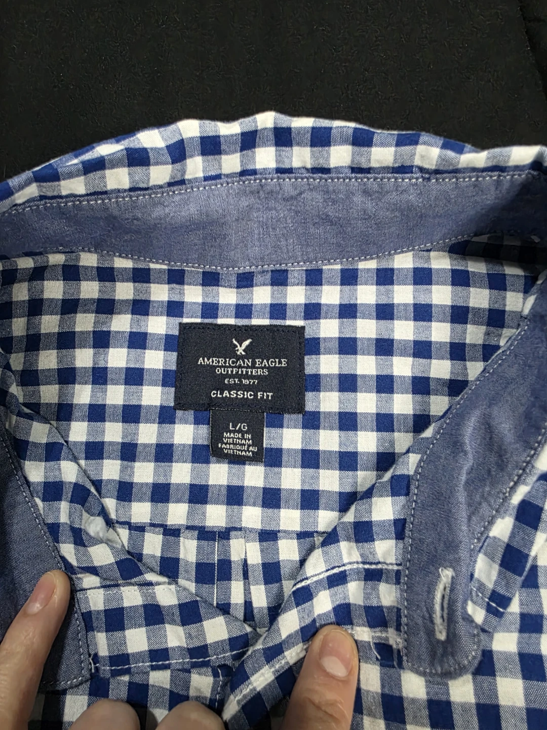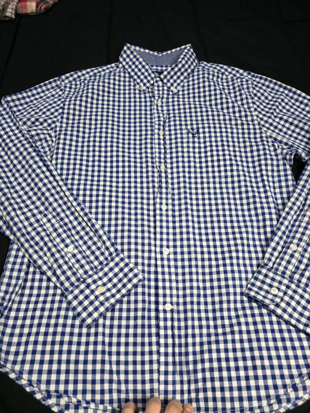 Here's a excellent used American Eagle button-down shirt. It features a classic blue and white gingham pattern, perfect for a casual or semi-formal look. The shirt has a front pocket and the American Eagle logo embroidered on it. It's in great condition and ready for a new owner!