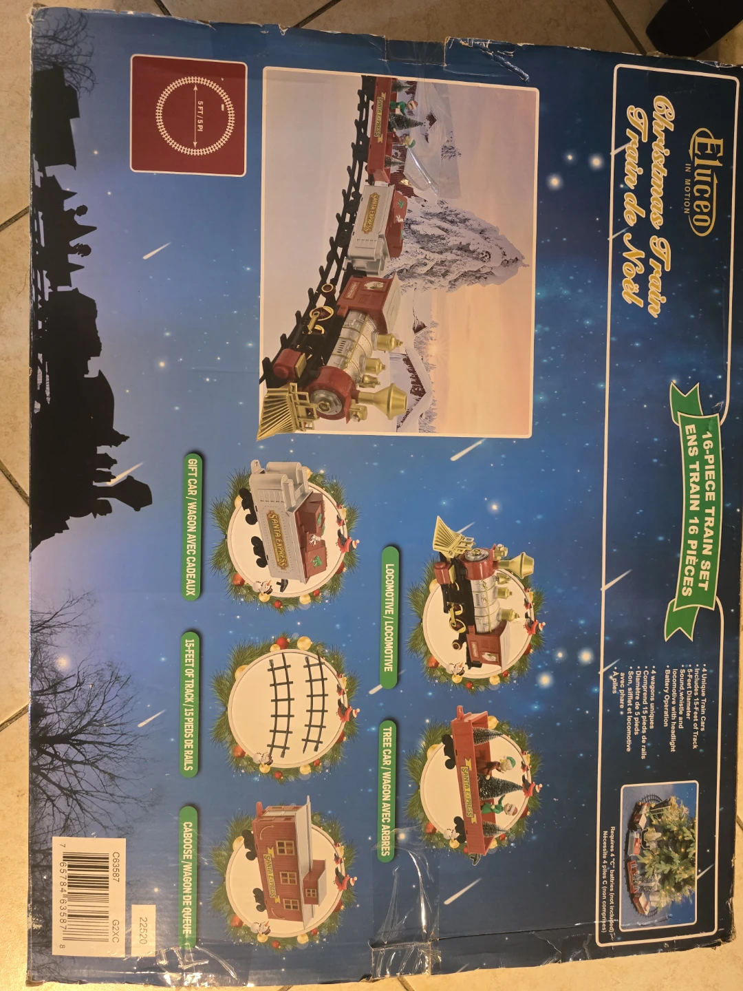 Selling an Eluceo Christmas Train de Noel 16-piece train set! It includes 15 feet of track and has a 5-foot diameter when set up. The train features sound effects, a whistle, and a locomotive with a headlight. It requires 4 'C' batteries (not included).