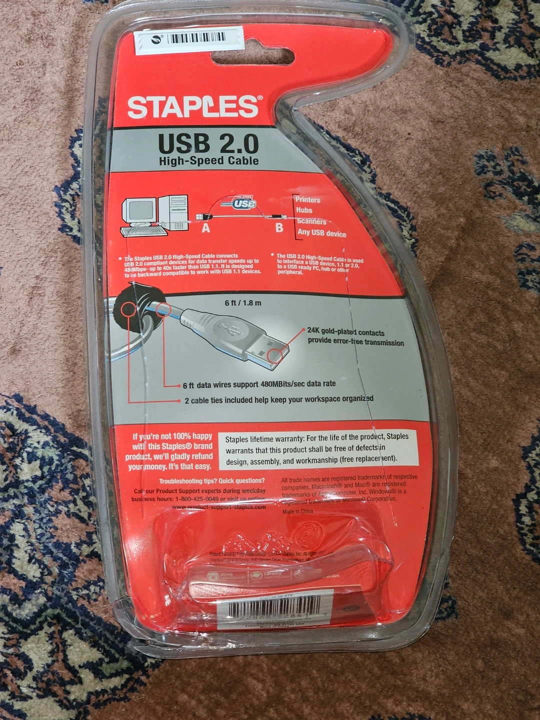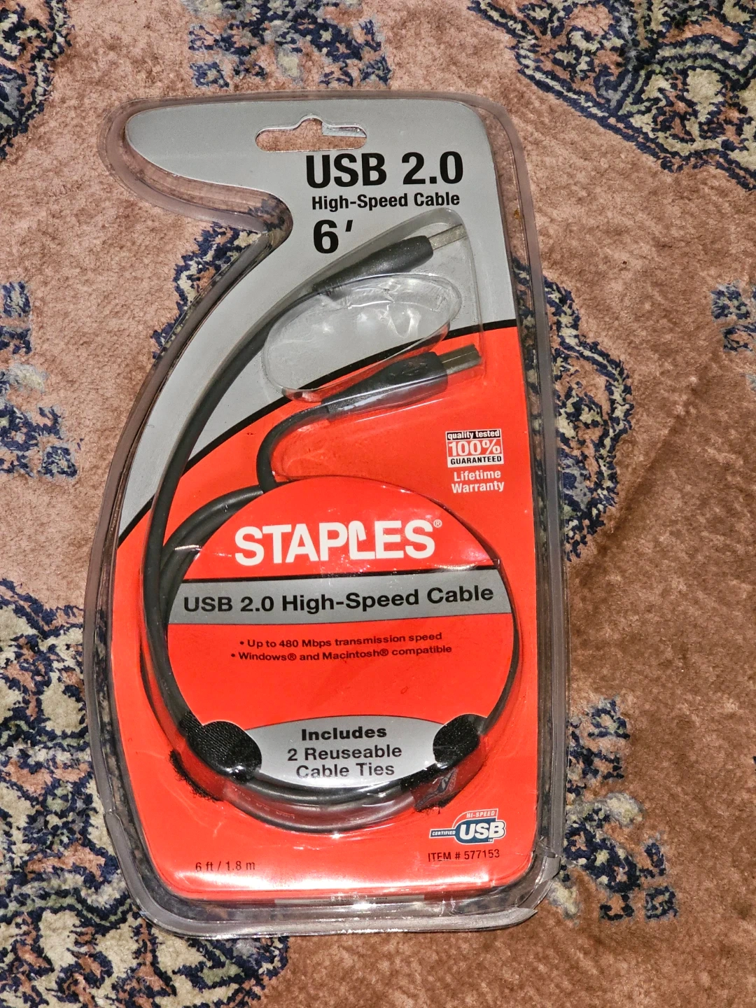 I'm selling a brand new Staples USB 2.0 High-Speed Cable, still in its original packaging! It's 6 feet long (1.8 m) and includes 2 reusable cable ties. This cable supports up to 480 Mbps transmission speed and is compatible with Windows and Macintosh. The packaging also notes it has 24K gold-plated contacts for error-free transmission