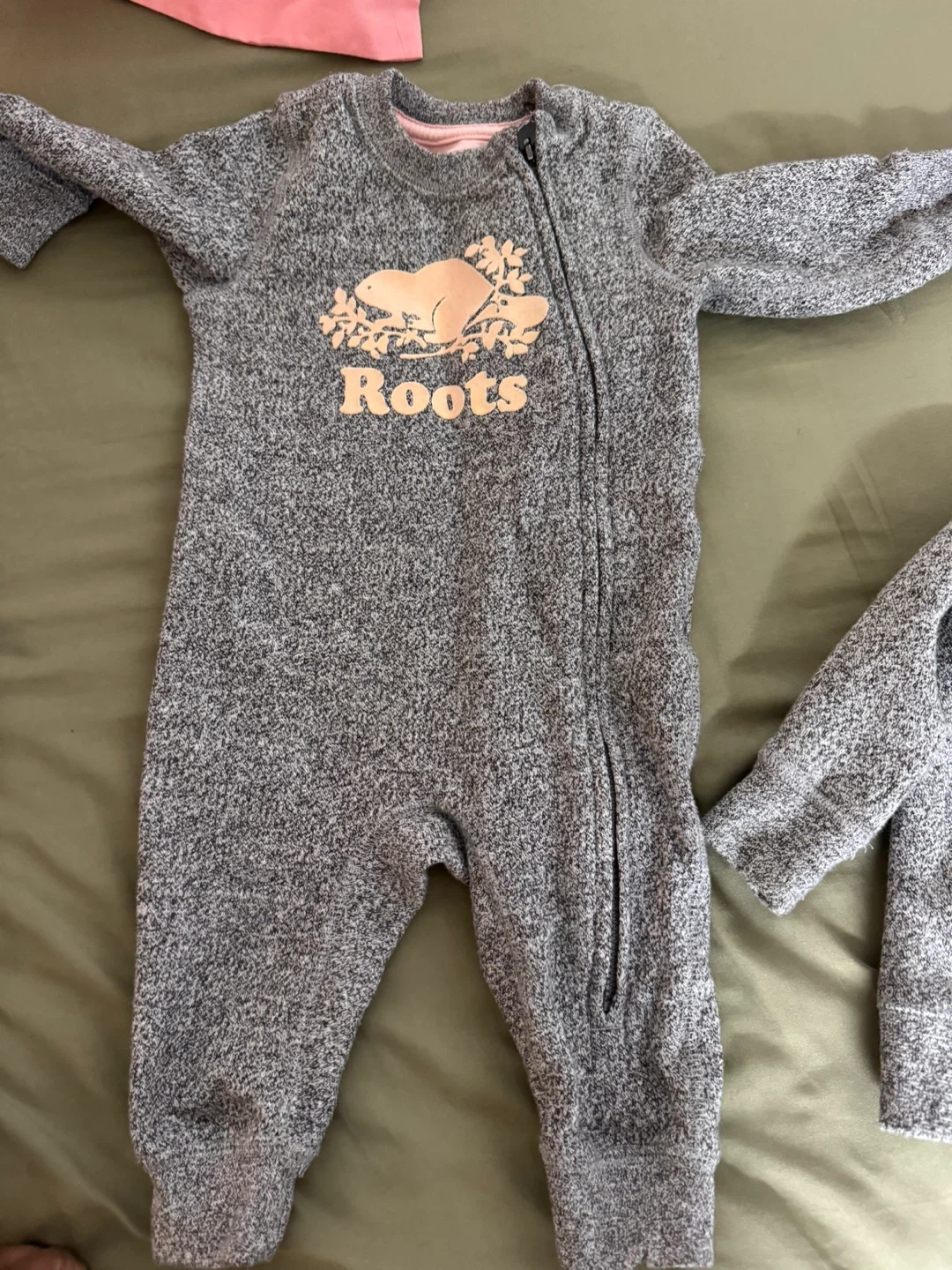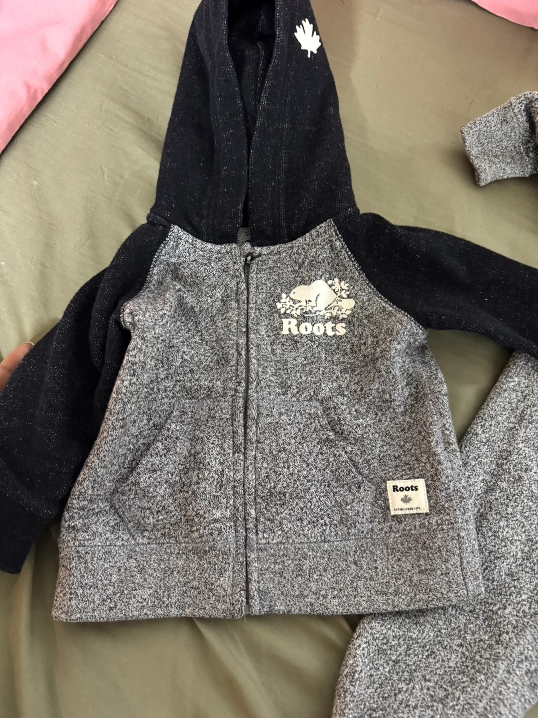 Selling a super cute baby set from Roots! Includes a zip-up hoodie and a onesie, both in a comfy heather grey. Perfect for keeping your little one cozy!