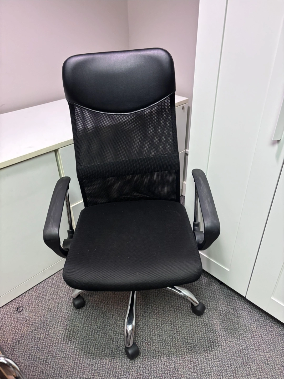 Selling a black office chair in good condition. It features a mesh back for breathability and adjustable height. Great for home or office use!