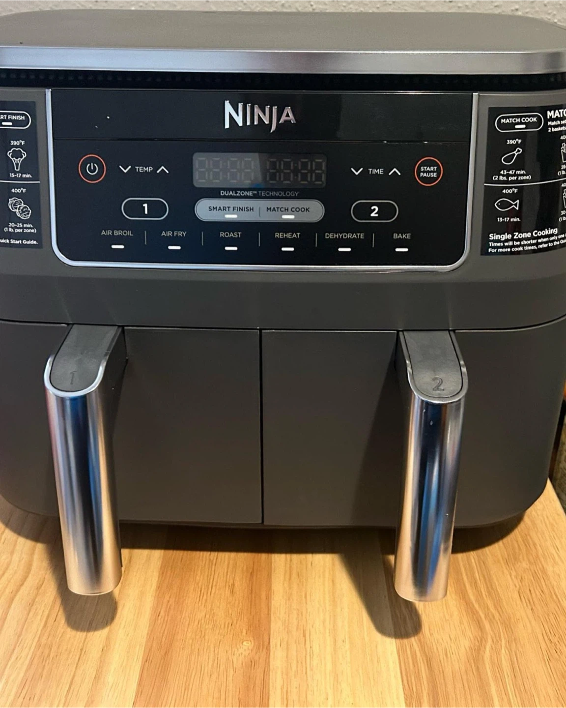Selling a Ninja Foodi 2-Basket Air Fryer! This air fryer has an 8-quart capacity and a gray matte finish. It comes with 2 individual 4-quart cooking baskets and 2 crisper plates, all nonstick and dishwasher safe. It also features DualZone Technology and a wide temperature range from 105°F to 450°F. Get ready for perfect meals with 6 functions and independent cyclonic fans & rapid heaters!