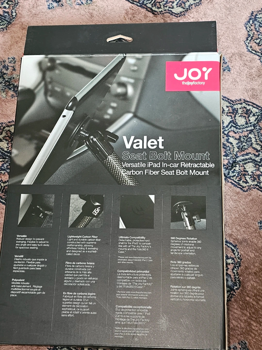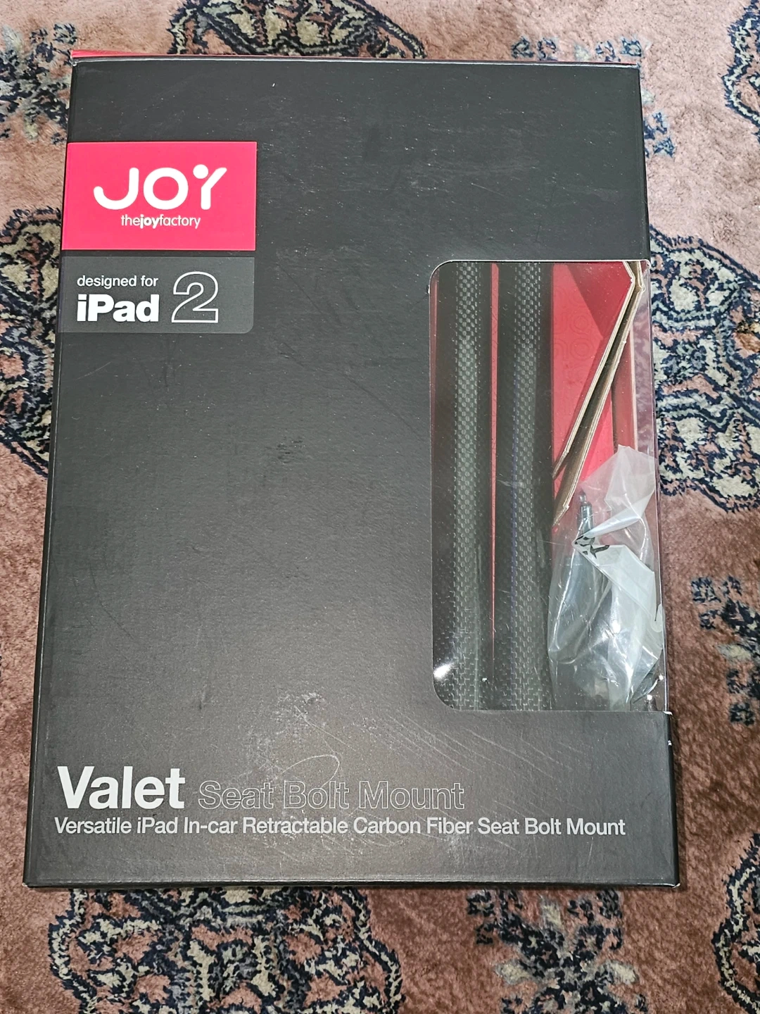 Selling a The Joy Factory Valet Seat Bolt Mount for iPad 2! This is a versatile in-car retractable carbon fiber seat bolt mount. It's designed to allow you to adjust your iPad to any angle and maximize spacing. The lightweight carbon fiber is constructed with supreme artisan quality and designed as a sophisticated accessory. Enjoy 360 degrees of rotation!