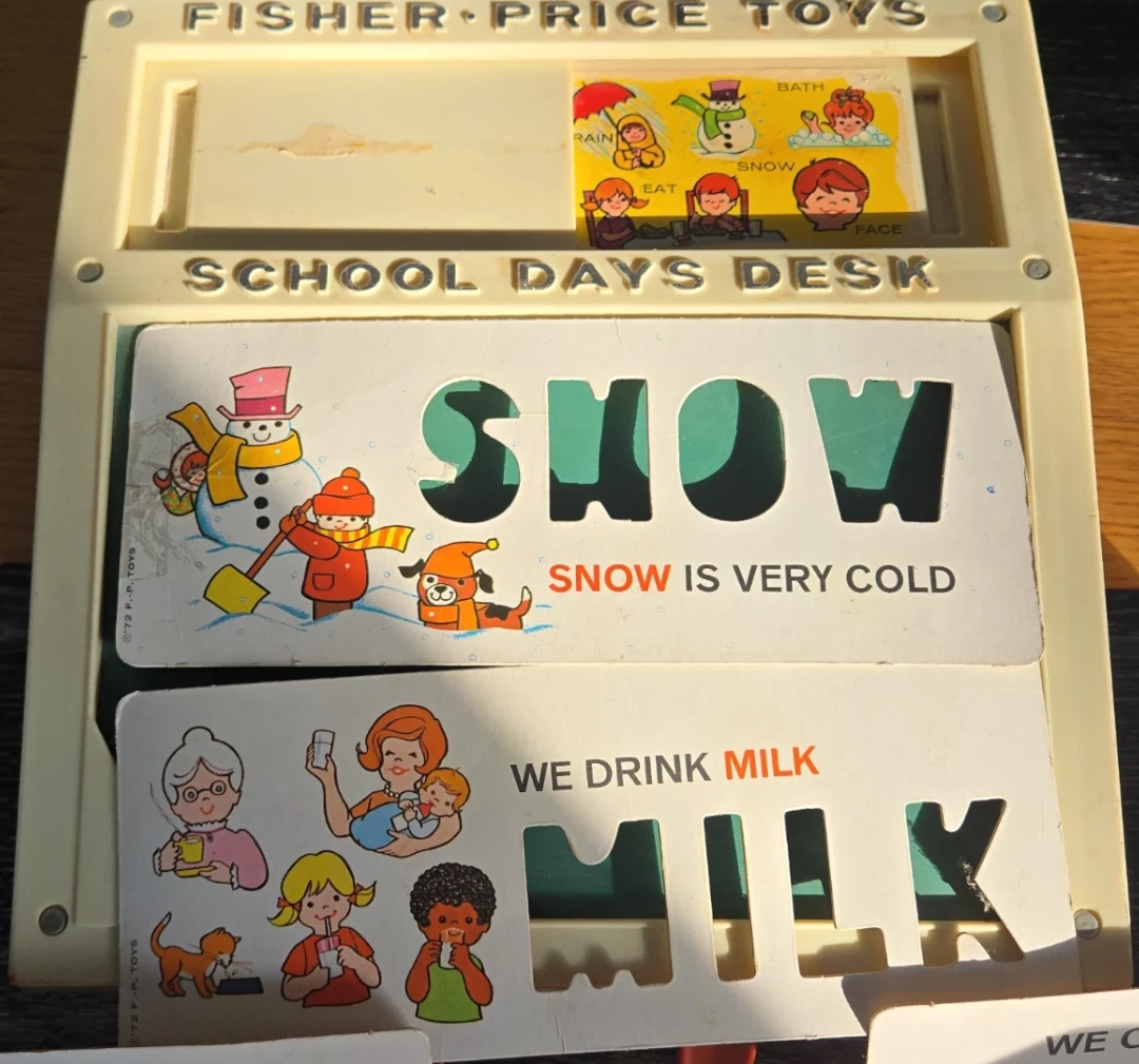 Selling a vintage Fisher Price School Days Desk toy! It's a great educational toy for kids, with colourful letters and interactive cards to learn about words and objects. Perfect for nostalgic collectors or for introducing a classic toy to a new generation