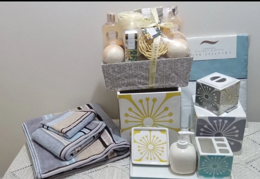 Here's a lovely Spa Luxetique bath gift basket, perfect for pampering yourself or a loved one! It comes with a variety of bath products to create a relaxing spa experience at home. Also included are some cute bathroom accessories to complete the set