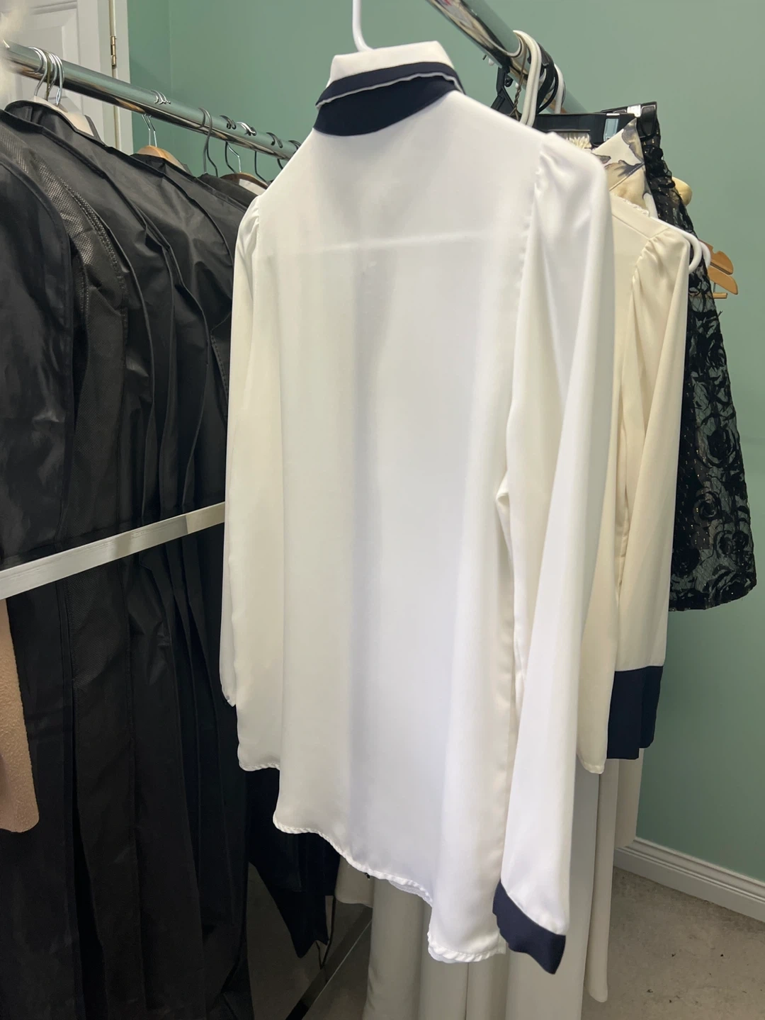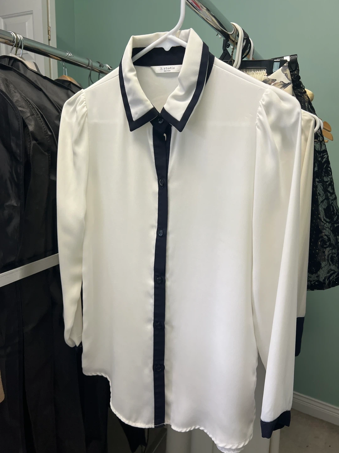 Here's a lovely blouse from J. Studio! It's a white blouse with navy trim on the collar, cuffs, and button placket. Perfect for a classy and stylish look!