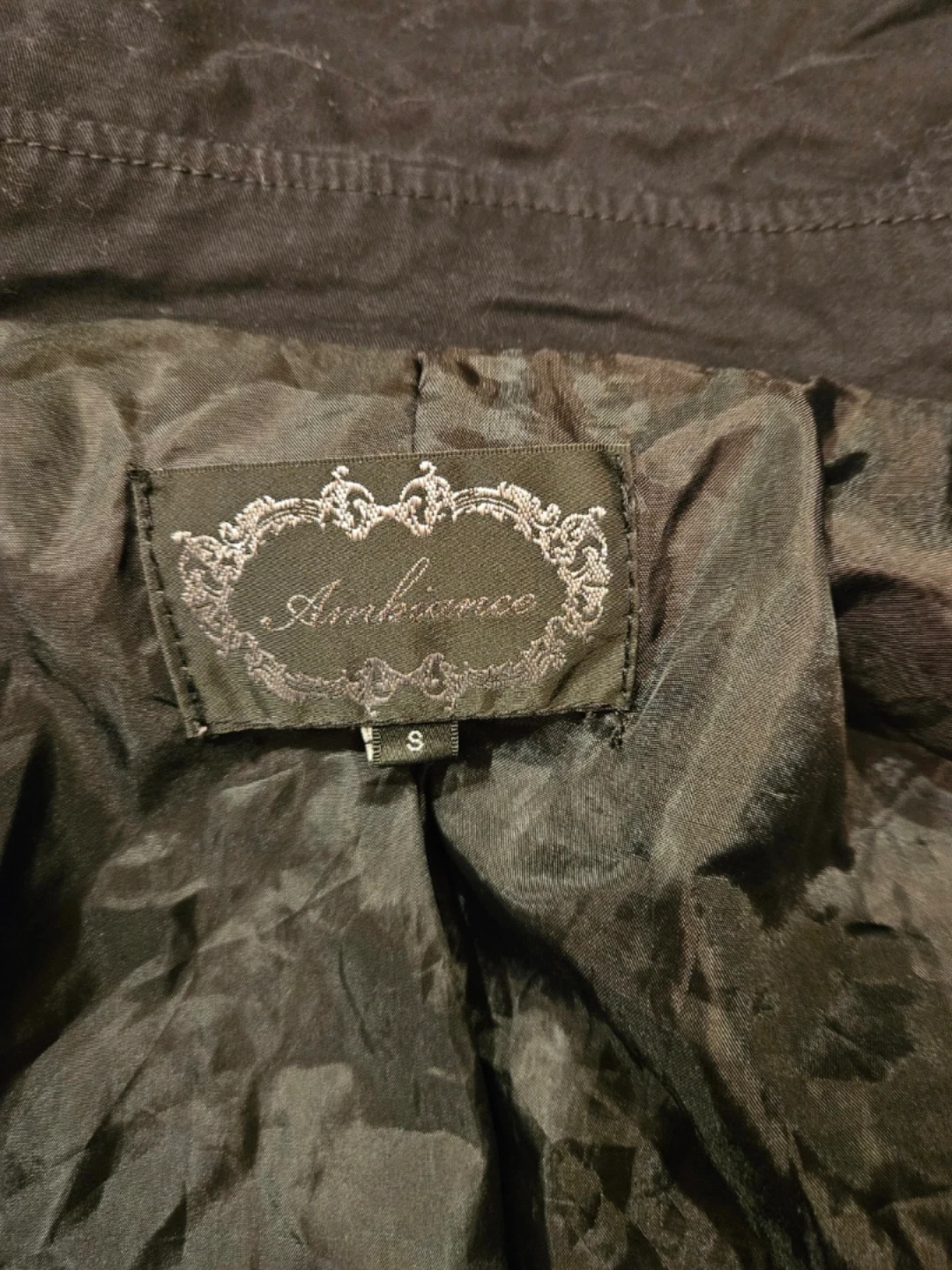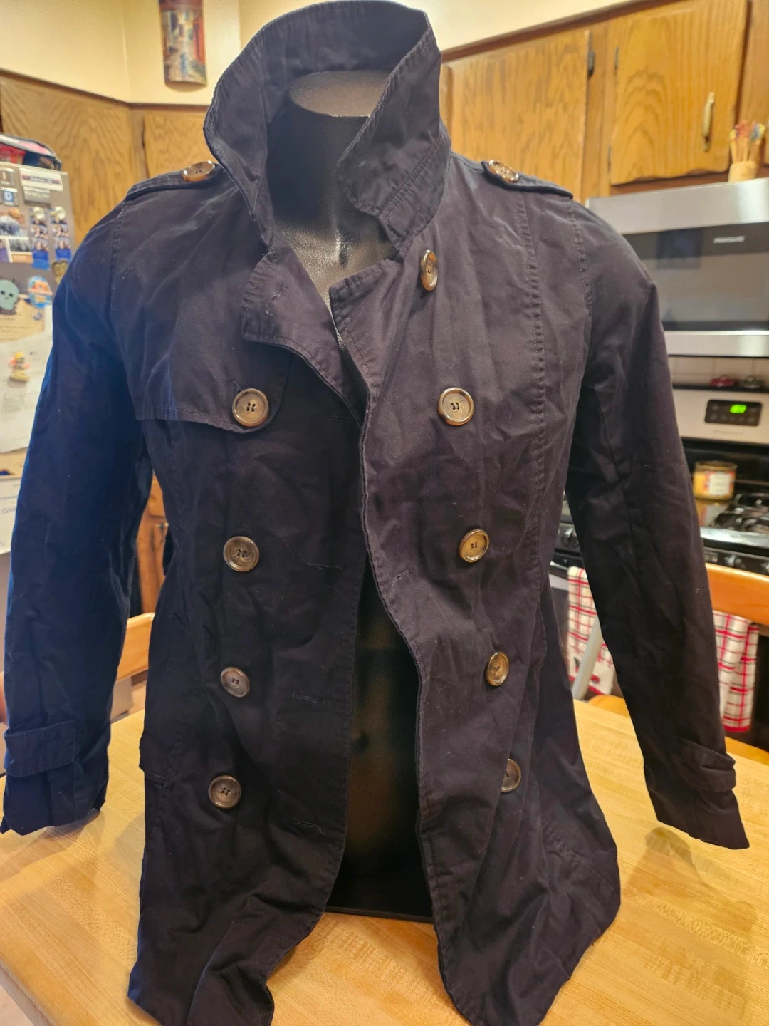 Here's a stylish black trench coat from Ambiance! It's a size small and features a double-breasted button closure. The outer shell is 100% cotton, while the lining is 100% polyester. Great for layering!