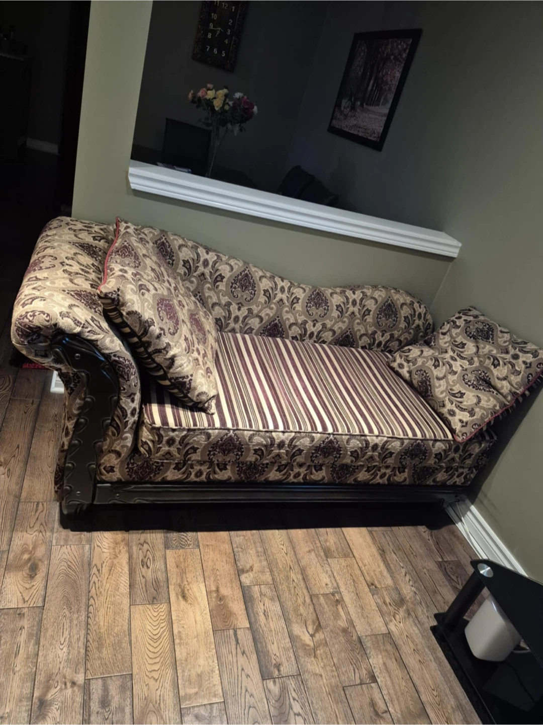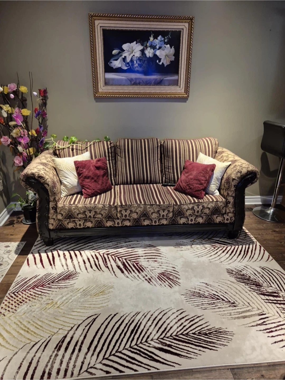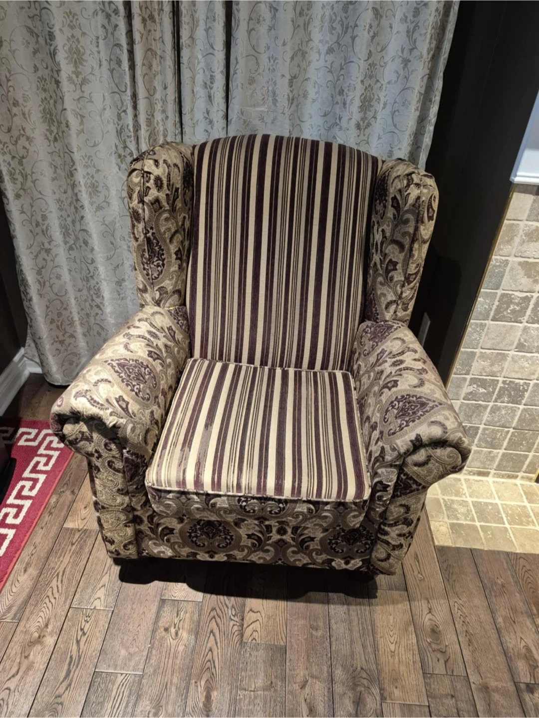 Selling a patterned sofa and armchair set. The set includes a sofa and a matching armchair, both in good condition. They would be a great addition to any living room or den!
