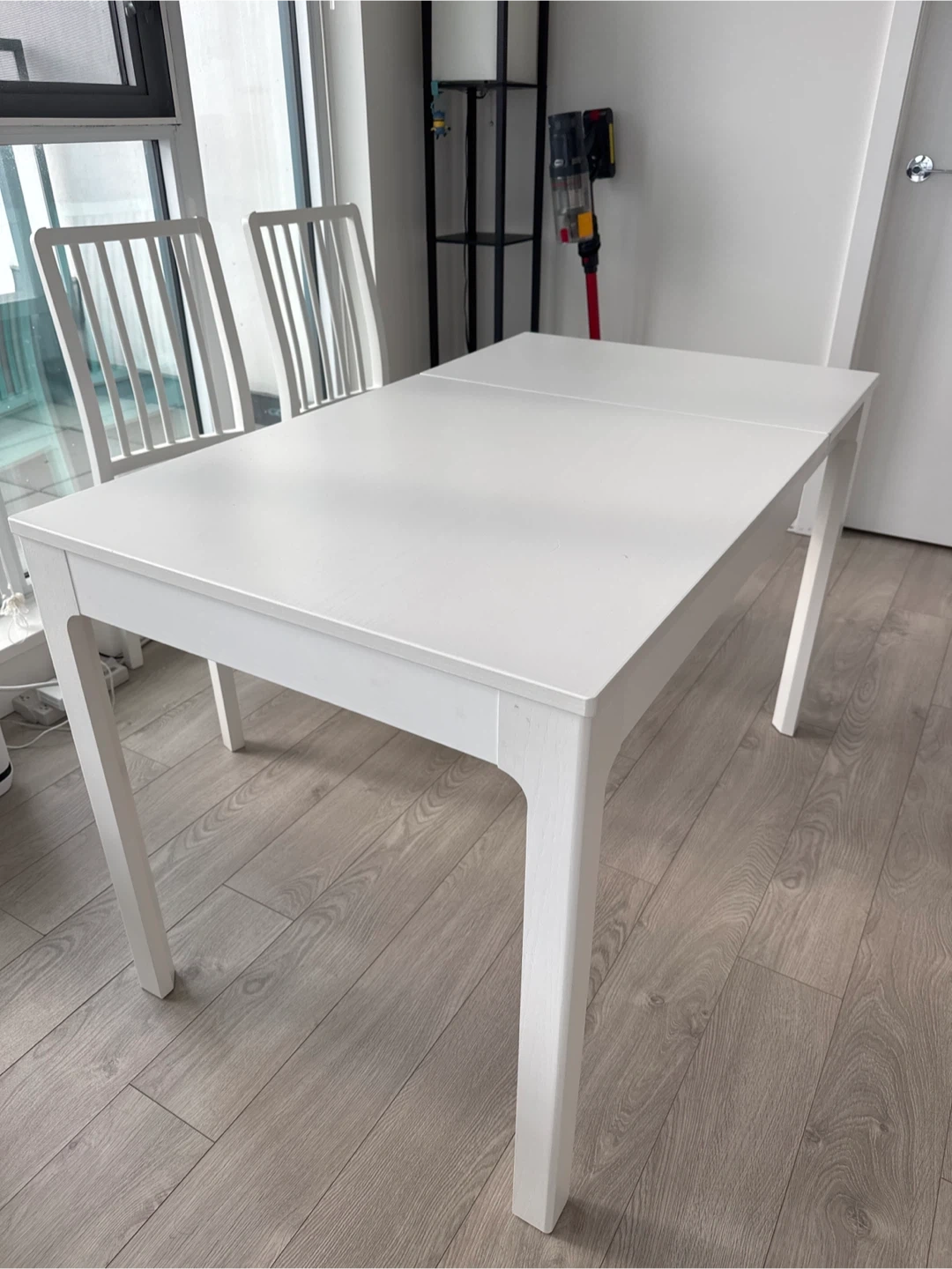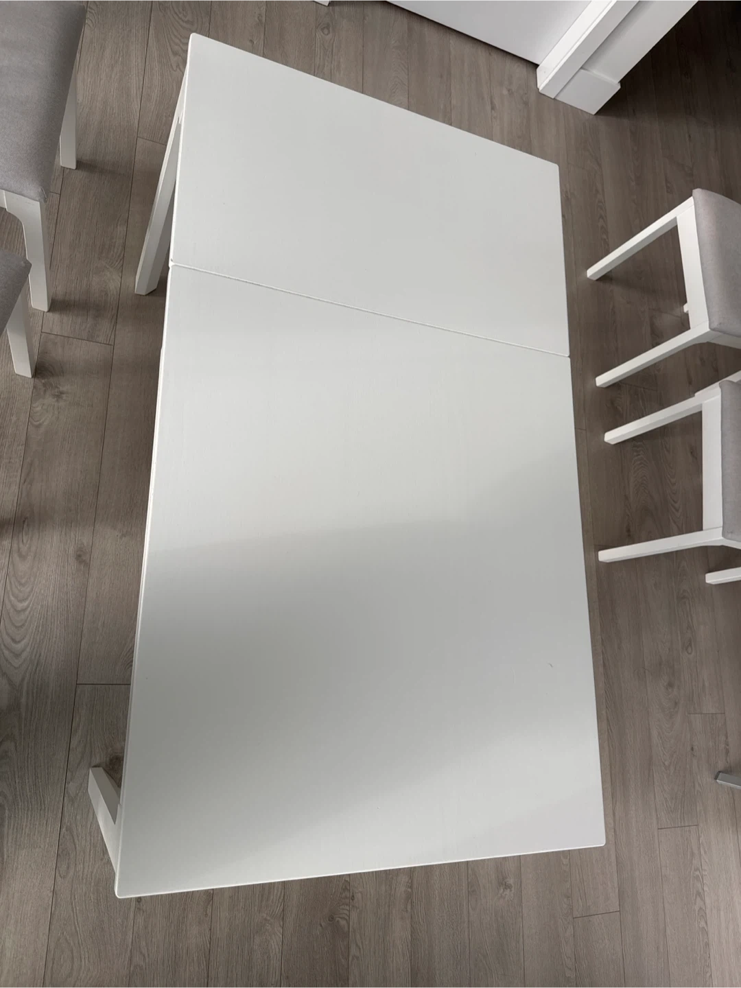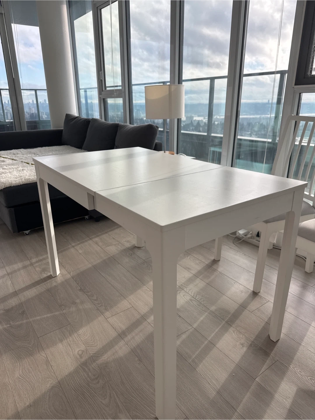 Selling a white extendable dining table! It's perfect for small spaces and can be extended when you have guests over. It's in great condition and ready for a new home!
