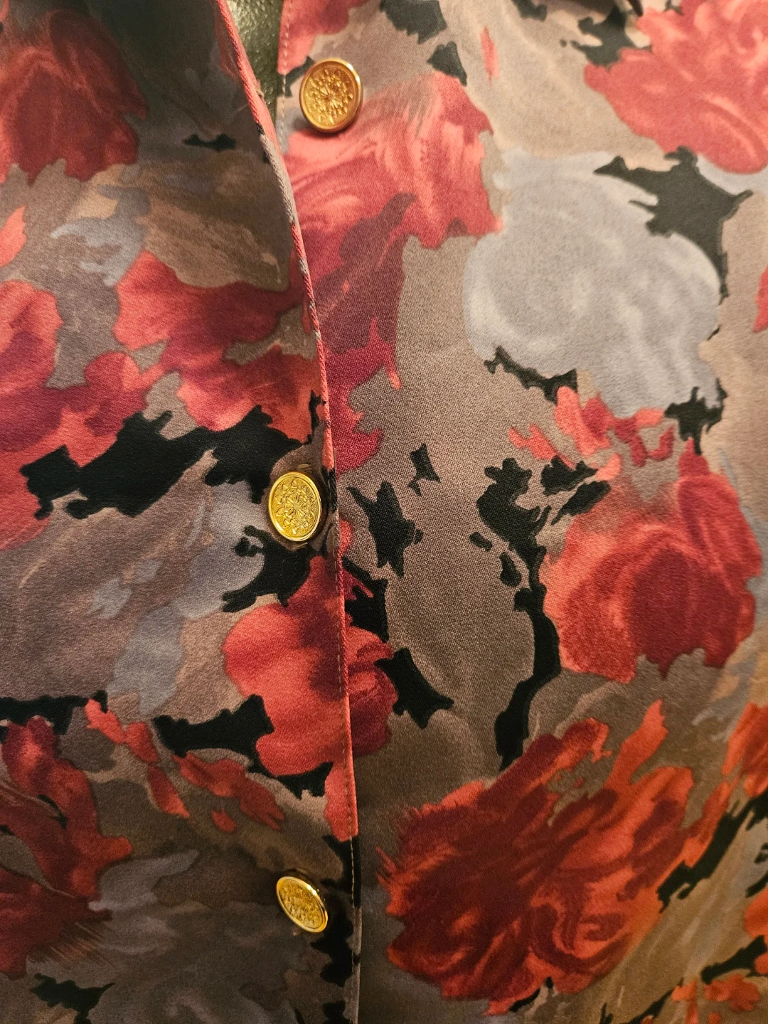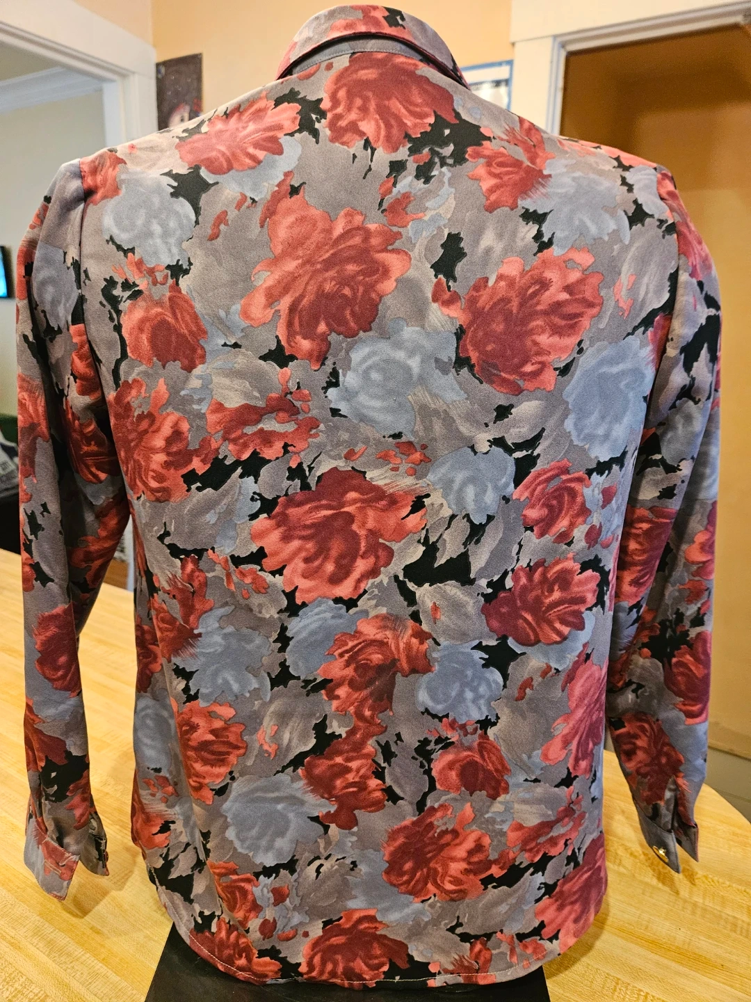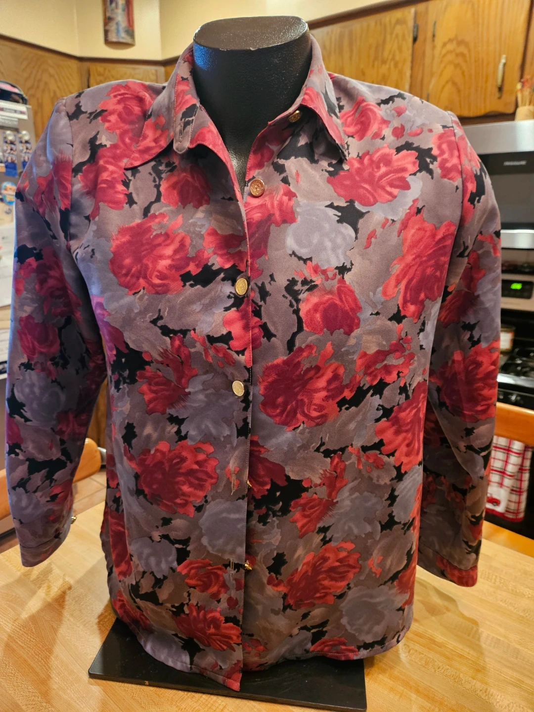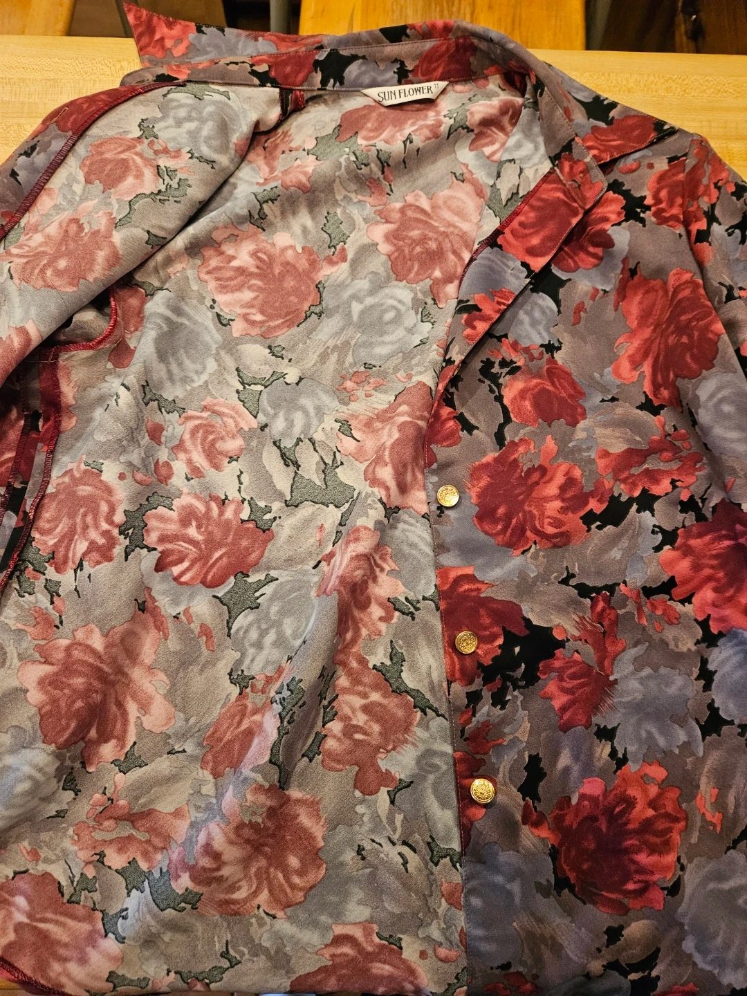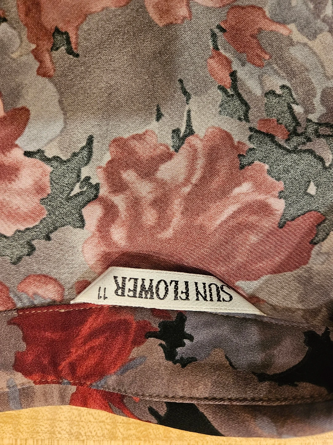Selling a gently used Sun Flower button-down shirt. It features a beautiful floral pattern with red and gray roses on a black background. Size 11. Perfect for adding a touch of vintage charm to your wardrobe!