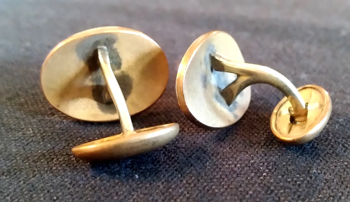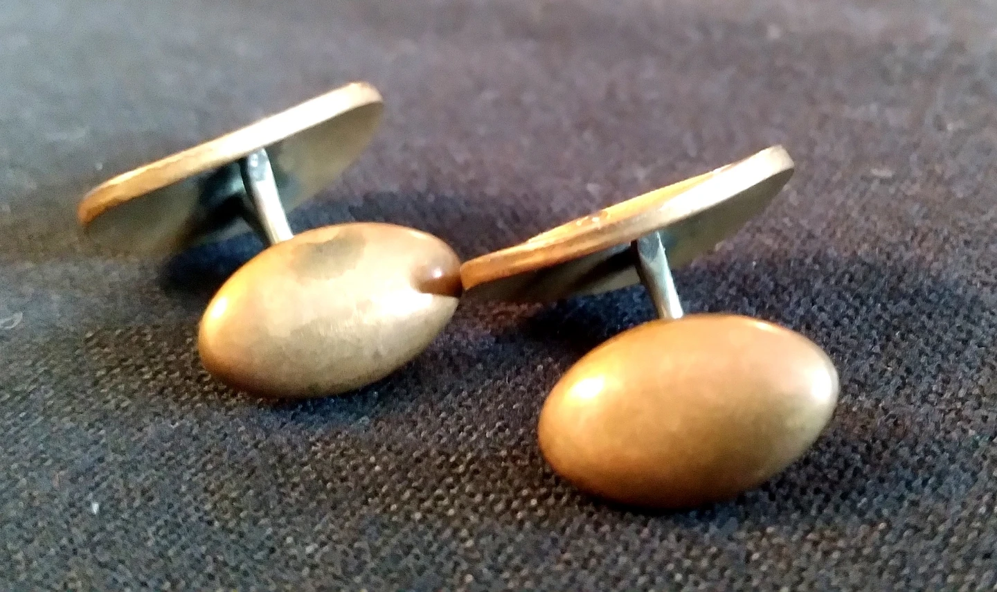 CUFFLINKS LOOK GREAT. THEY HAVE A NICE BRONZE COLOUR AND A MUTED SHINE. METAL IS UNKNOWN. THEY ARE A BIT WORN AND SHOW TARNISH AT THE BACK.