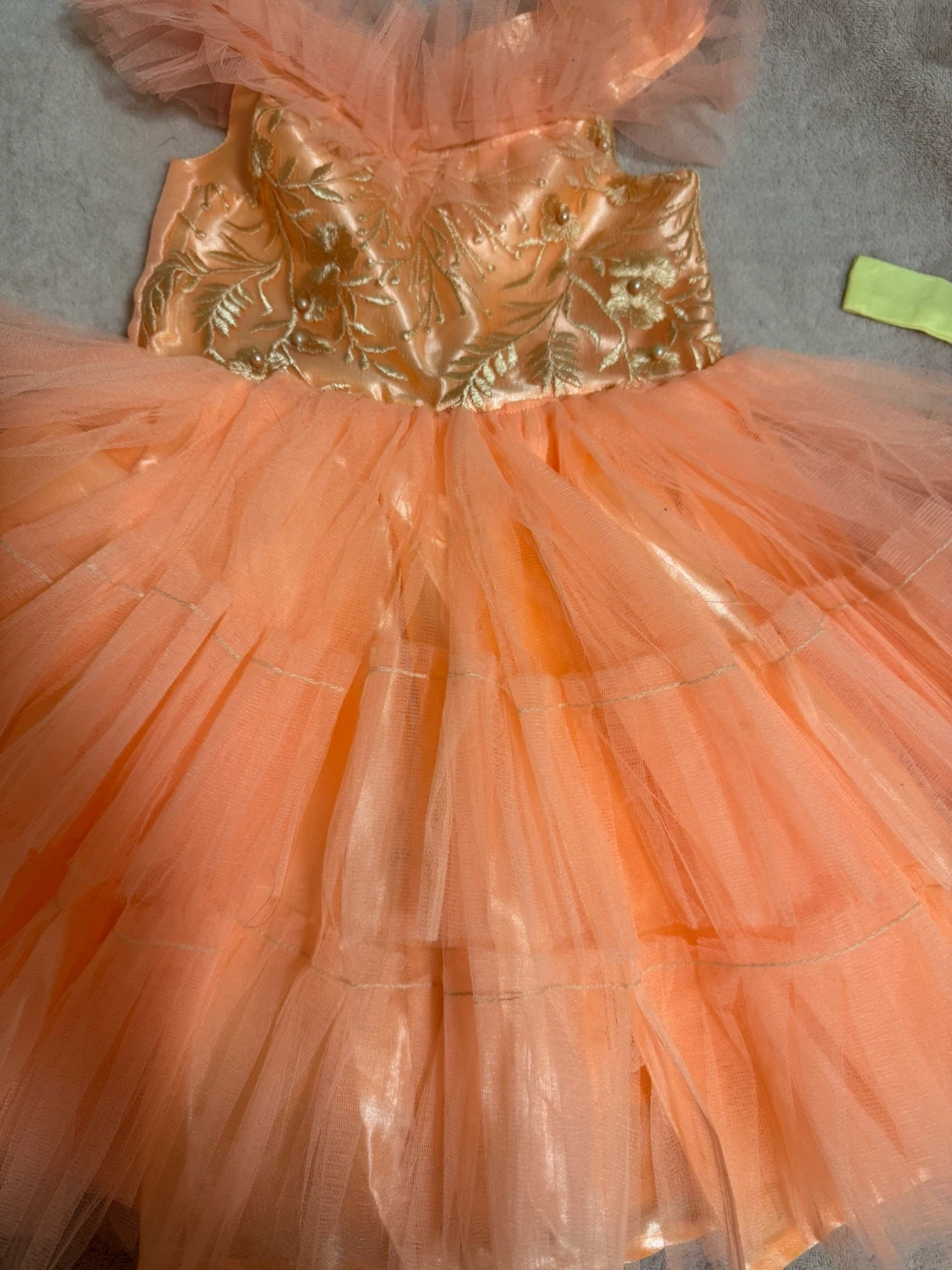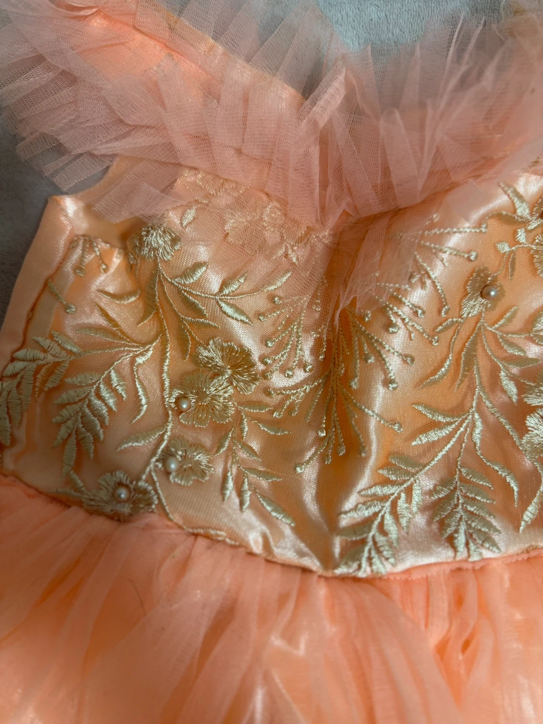 A charming peach-coloured dress featuring tulle fabric and a delicate embroidered bodice. It's in great condition and ready for a new occasion