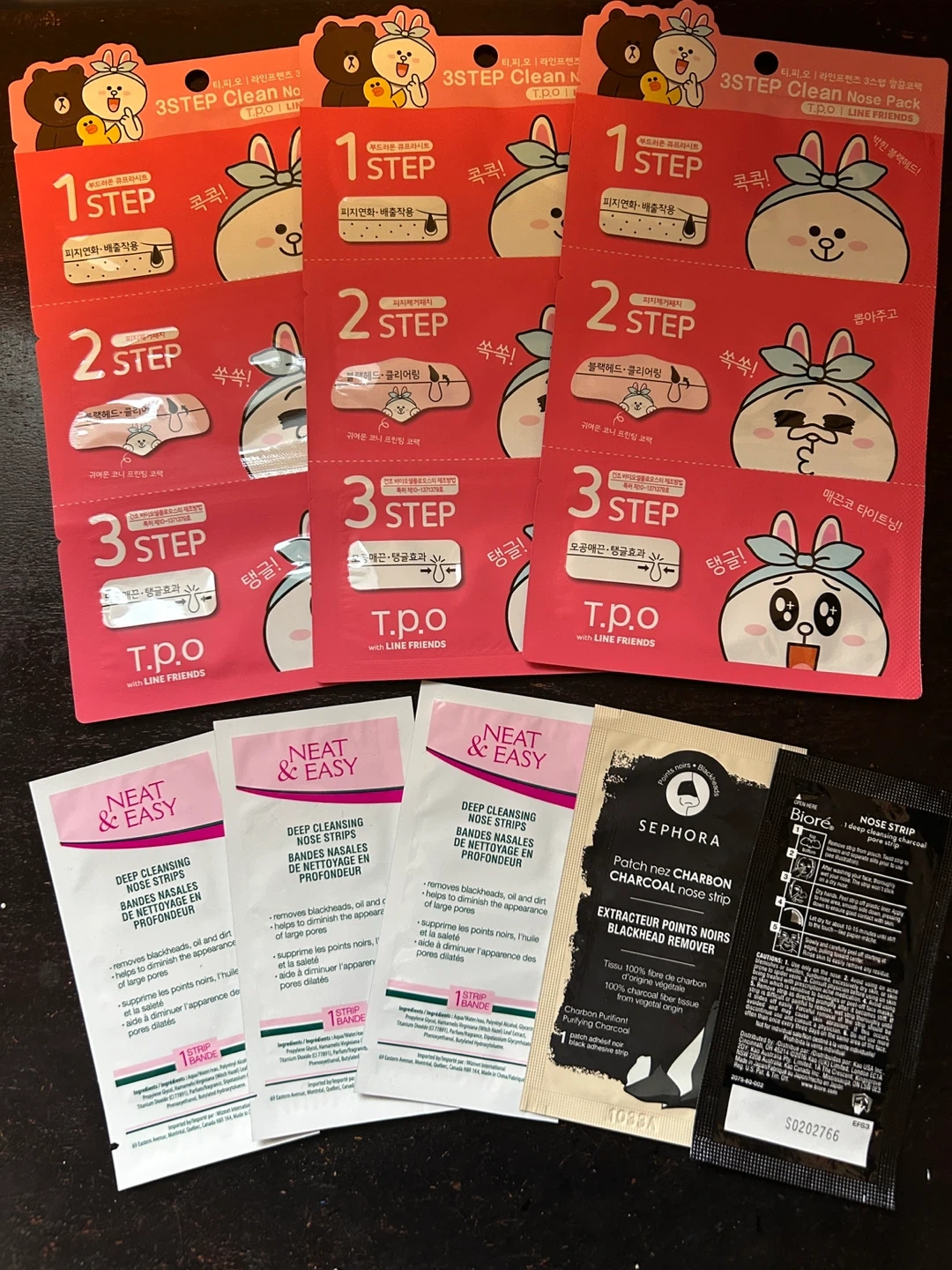 I'm selling a nose strip bundle pack! It's a fun and effective way to care for your pores. Three Neat & Easy, one from Sephora, and one from Biore. Will include 3 free line friends 3-step nose strip if you take all, please note that the production date for the line friends is 2022. Each pack helps remove blackheads and leave your skin feeling smooth and refreshed. Perfect for a little self-care! Take the whole set for $5!