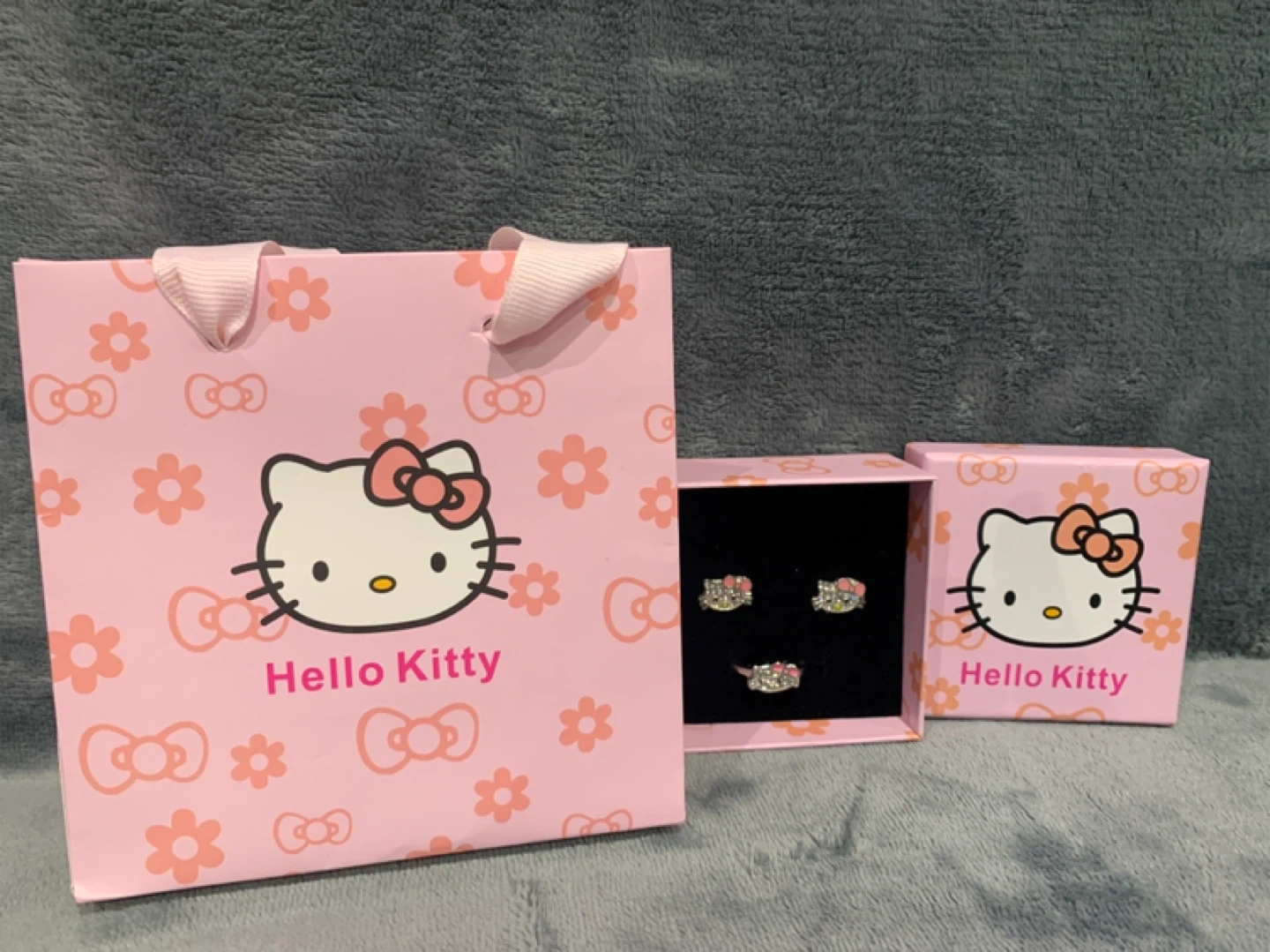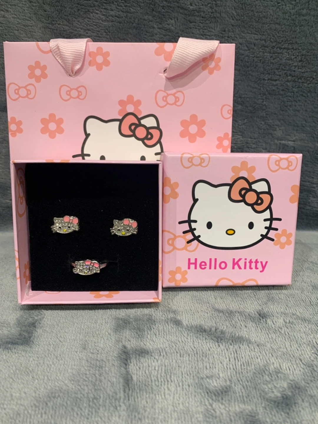 Selling a super cute Hello Kitty ring and earring set! It comes with the box and shopping bag, making it a perfect gift or a treat for yourself. The set includes a ring and a pair of earrings, all featuring the iconic Hello Kitty design. They're in excellent condition and ready to add a touch of kawaii to your collection!