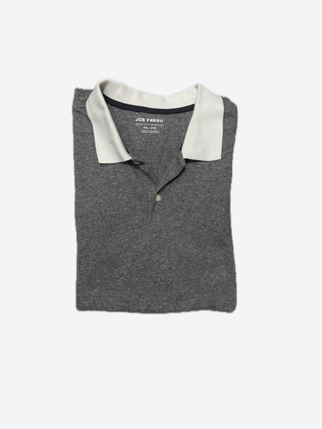 Selling a Joe Fresh polo shirt in size XXL. It's a stylish grey colour with a white collar. Short sleeves. Perfect for a casual look!