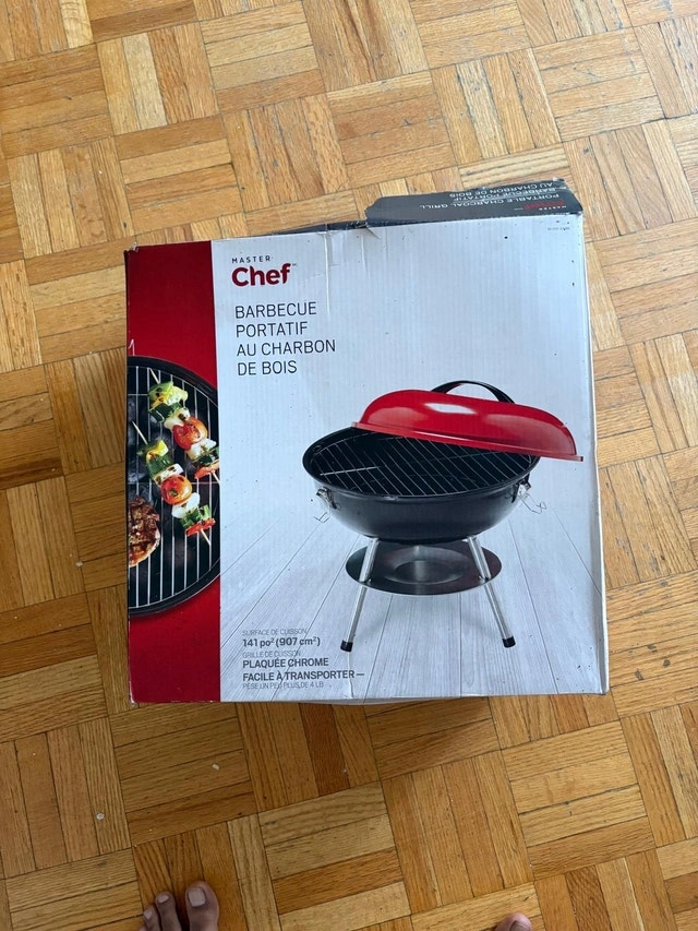 Get ready to grill on the go with this Master Chef portable charcoal BBQ! This barbecue boasts a 141 sq inch cooking surface and a chrome-plated grill, making it perfect for small gatherings or picnics. It is in good condition and ready to be assembled and used!