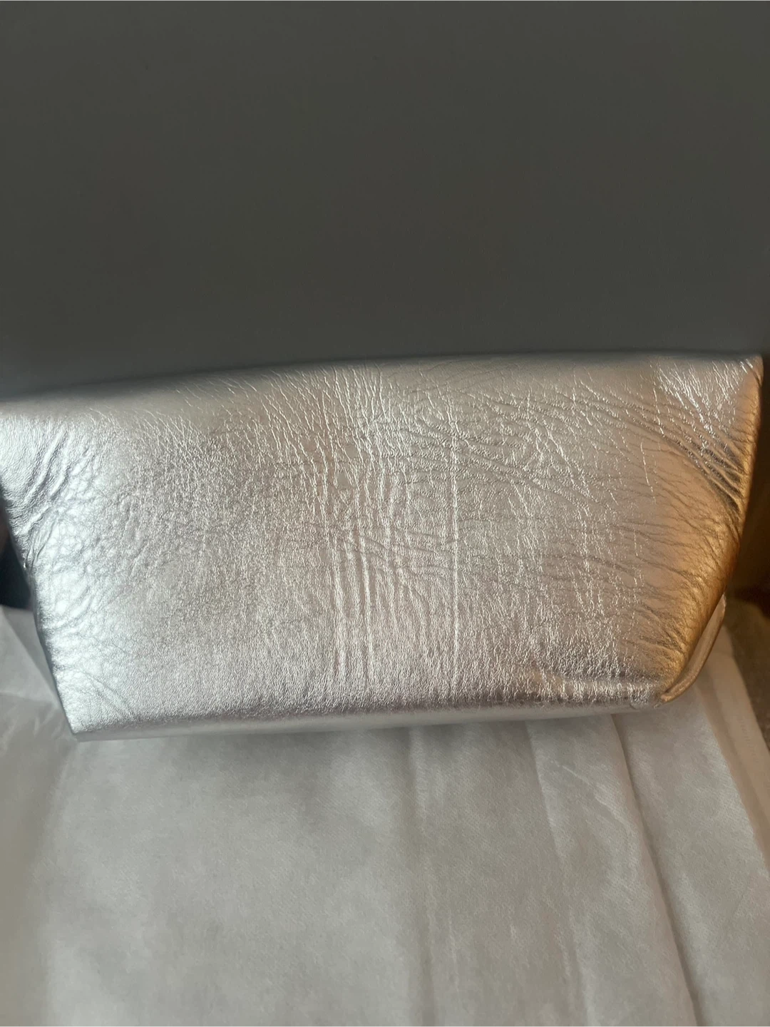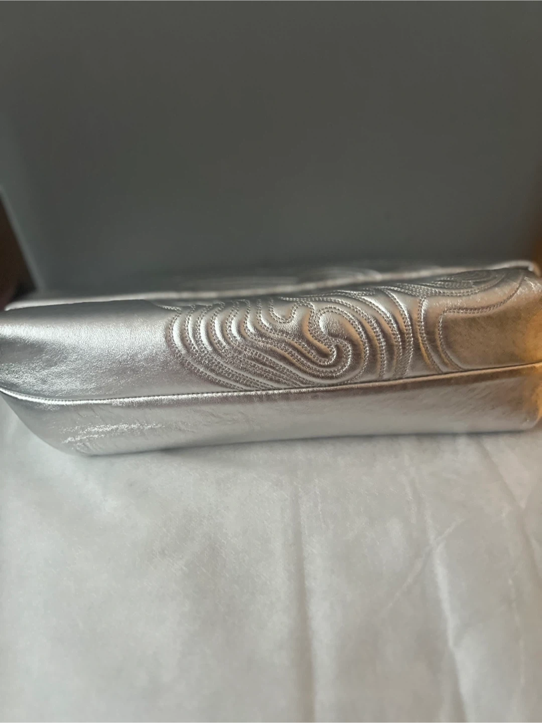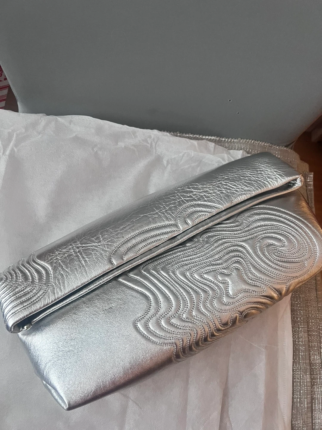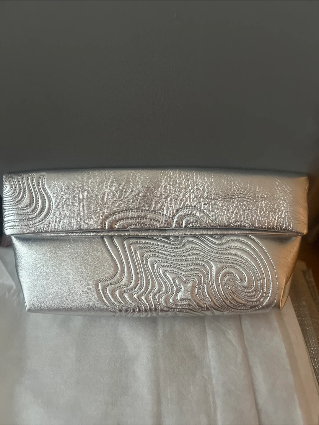 Selling a stylish silver clutch! Lambing leather. It's in great condition and has a unique textured design. Perfect for a night out or special occasion