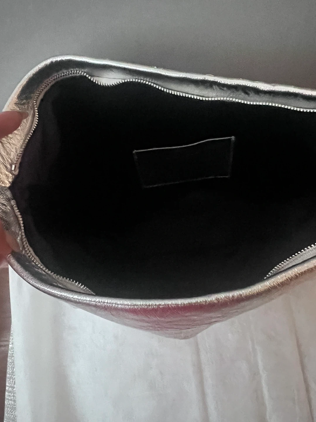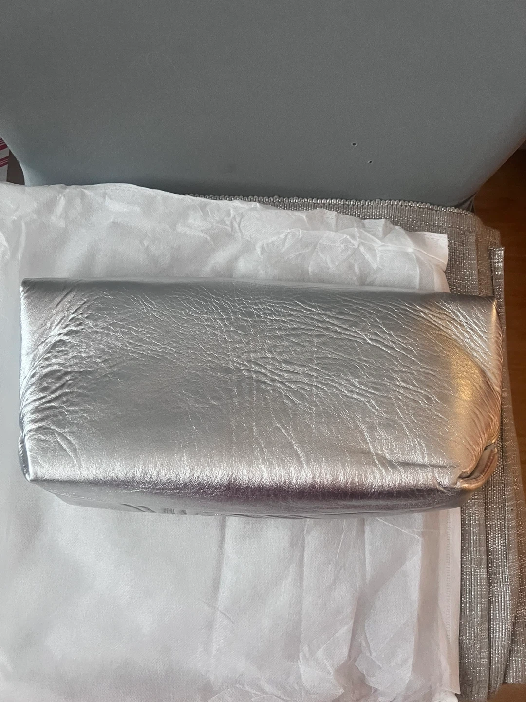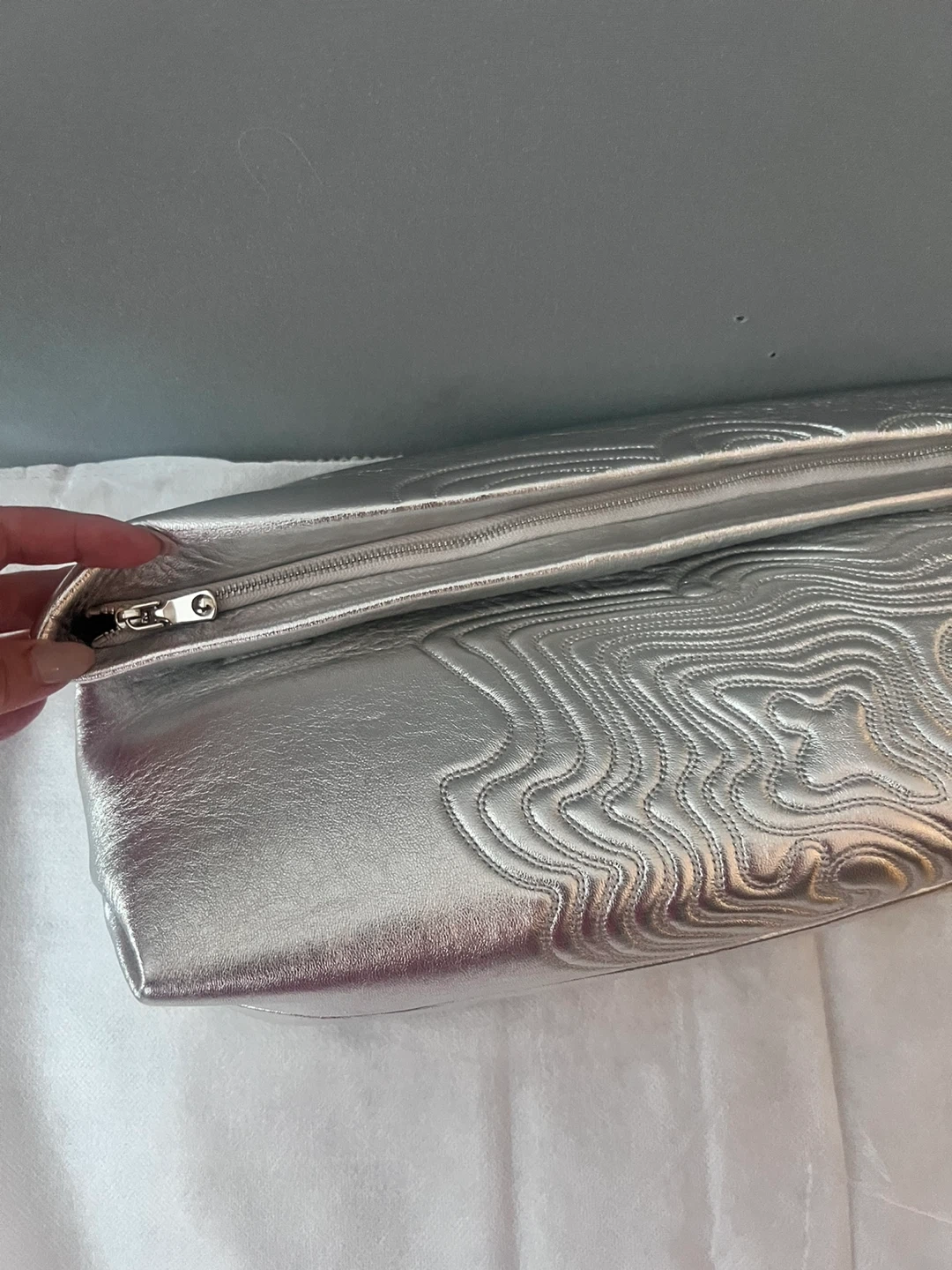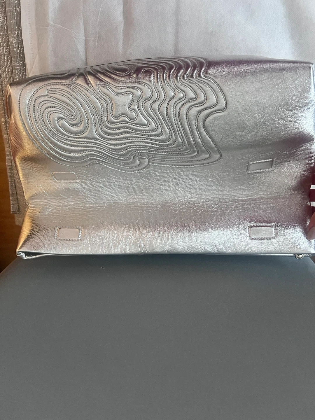 Selling a stylish silver clutch! Lambing leather. It's in great condition and has a unique textured design. Perfect for a night out or special occasion