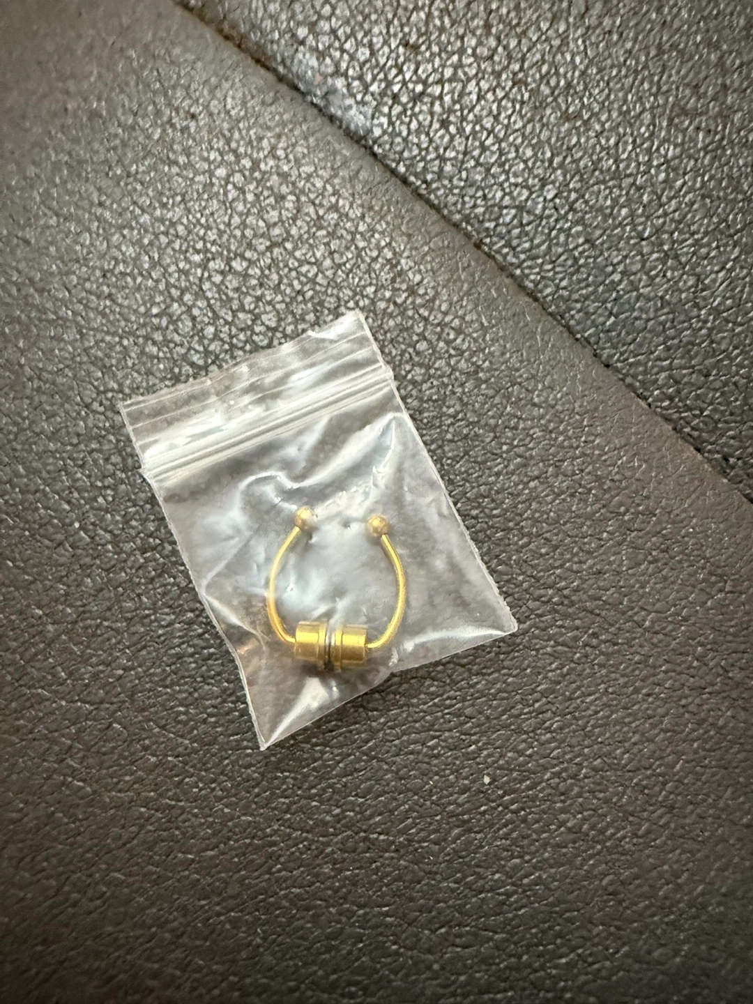 I'm selling a brand new gold-colored magnetic septum nose ring! It comes in a small plastic bag, ready for you to wear. A fun and easy way to change up your look!