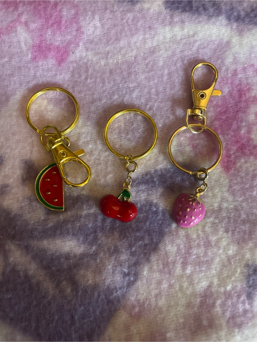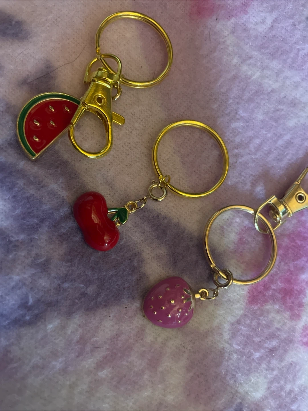 Here's a cute set of fruit-themed keychains! You get a watermelon slice, a cherry, and a strawberry, all with gold-tone hardware. Perfect for adding a little fun to your keys or bag! Sold separate five dollars each
