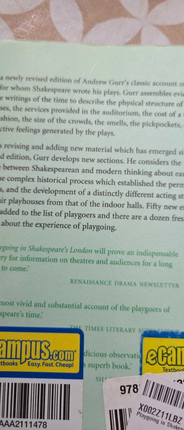 Andrew Gurr's classic account of Shakespeare's historical audience assembles evidence from the writings of the time to describe the physical, social and mental conditions of playgoing. In addition to revising and adding new material which has emerged since the second edition, Gurr develops new sections about points of special interest. Fifty new entries have been added to the list of playgoers and a dozen new quotations about the experience of playgoing.