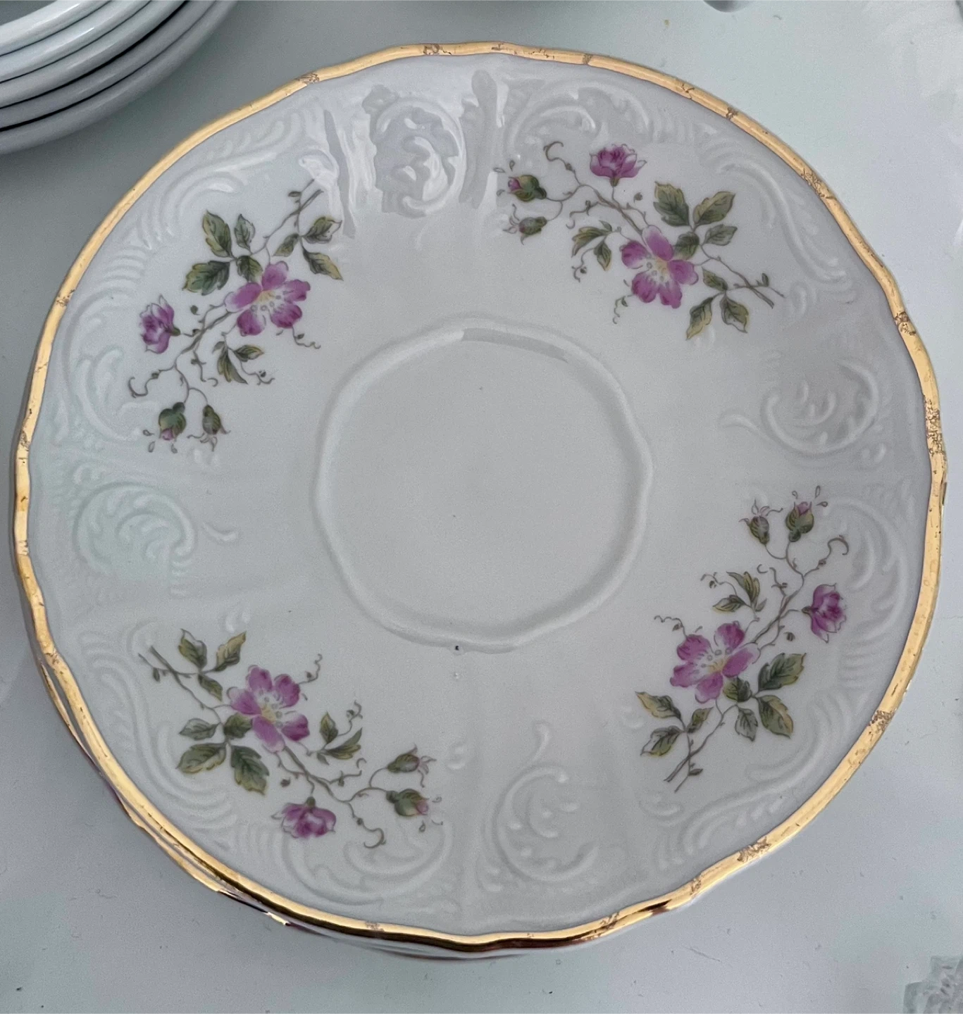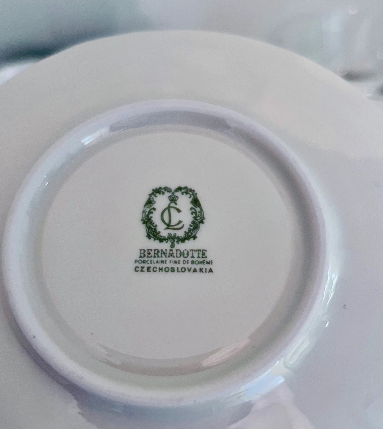 4 Antique Bernadotte porcelain saucers, fine de Boheme, from Czechoslovakia. They feature a lovely floral design with a gold trim. Perfect for completing your tea set or adding a touch of vintage elegance to your table! In good vintage condition - no chips, cracks, some barely noticeable aging on gold trim, one plate shows signs of age on back.