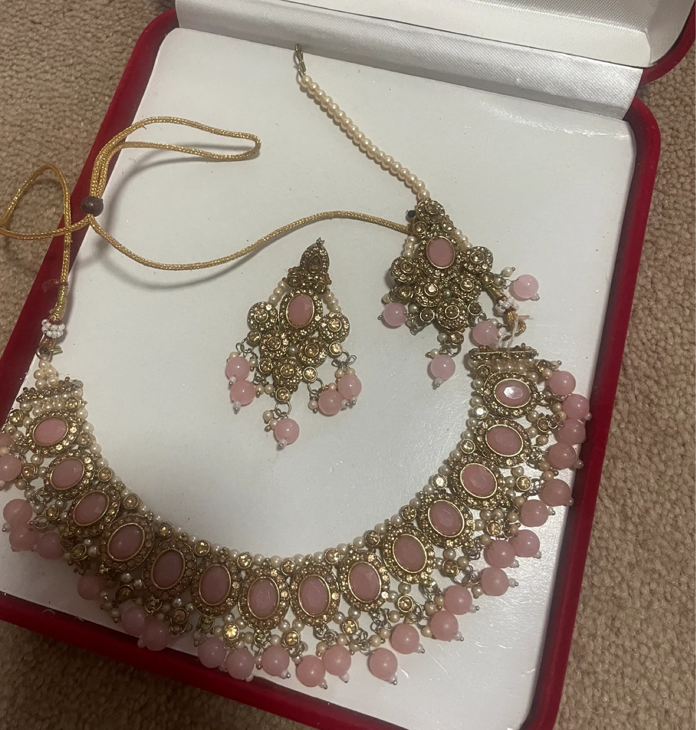 Not FREEE $40 Beautiful necklace and earring set in pink and gold tones. Perfect for adding a touch of elegance to any outfit!