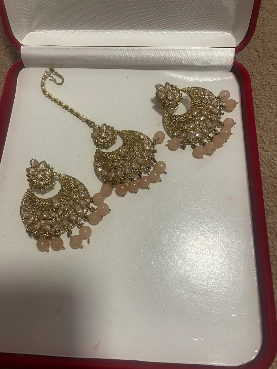 $ 35Selling a beautiful earring and tikka set . The set is gold in colour with peach coloured beads.