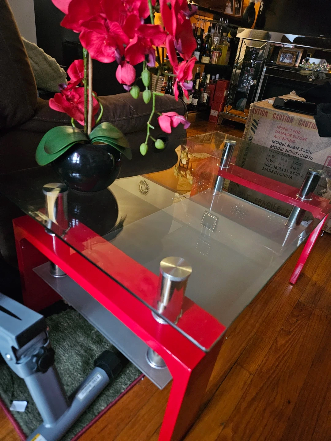 Selling a stylish coffee table with a red frame and glass top! The model number is SF-CF076. It measures approximately 24.0 x 31.8 x 17.3 inches. Made in China.