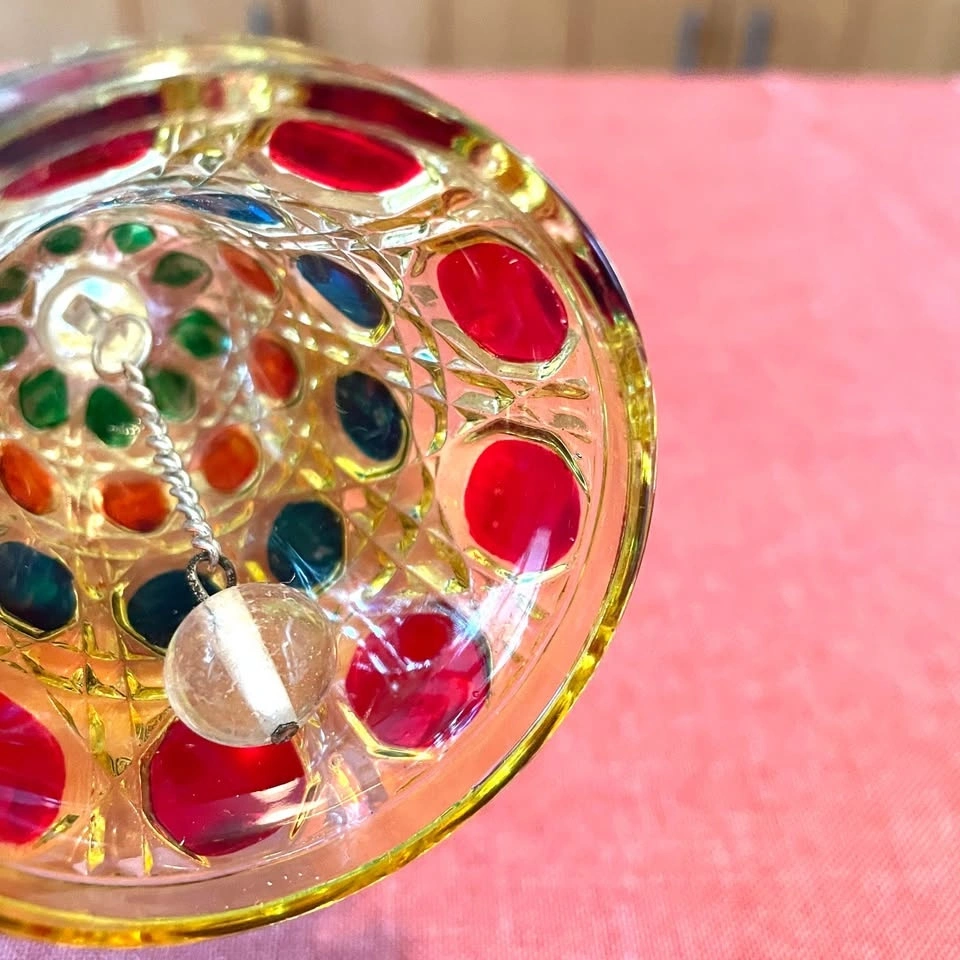 📍Pick up at Don Mils & Steeles Vintage 24% Lead Crystal Glass Bell with Multicolored Jeweled Design Stunning vintage handbell crafted from high-quality 24% lead crystal glass. The crystal bell body features an intricate cut pattern with vibrant multicolored accents in red, blue, green and orange. The handle has a faceted top and subtle yellow tint. It rings with a clear, pleasant tone when gently rung. Origin: Nagasaki, Japan Condition: Excellent vintage condition with original box (box shows some aging) A charming and collectible piece of Japanese glassware!