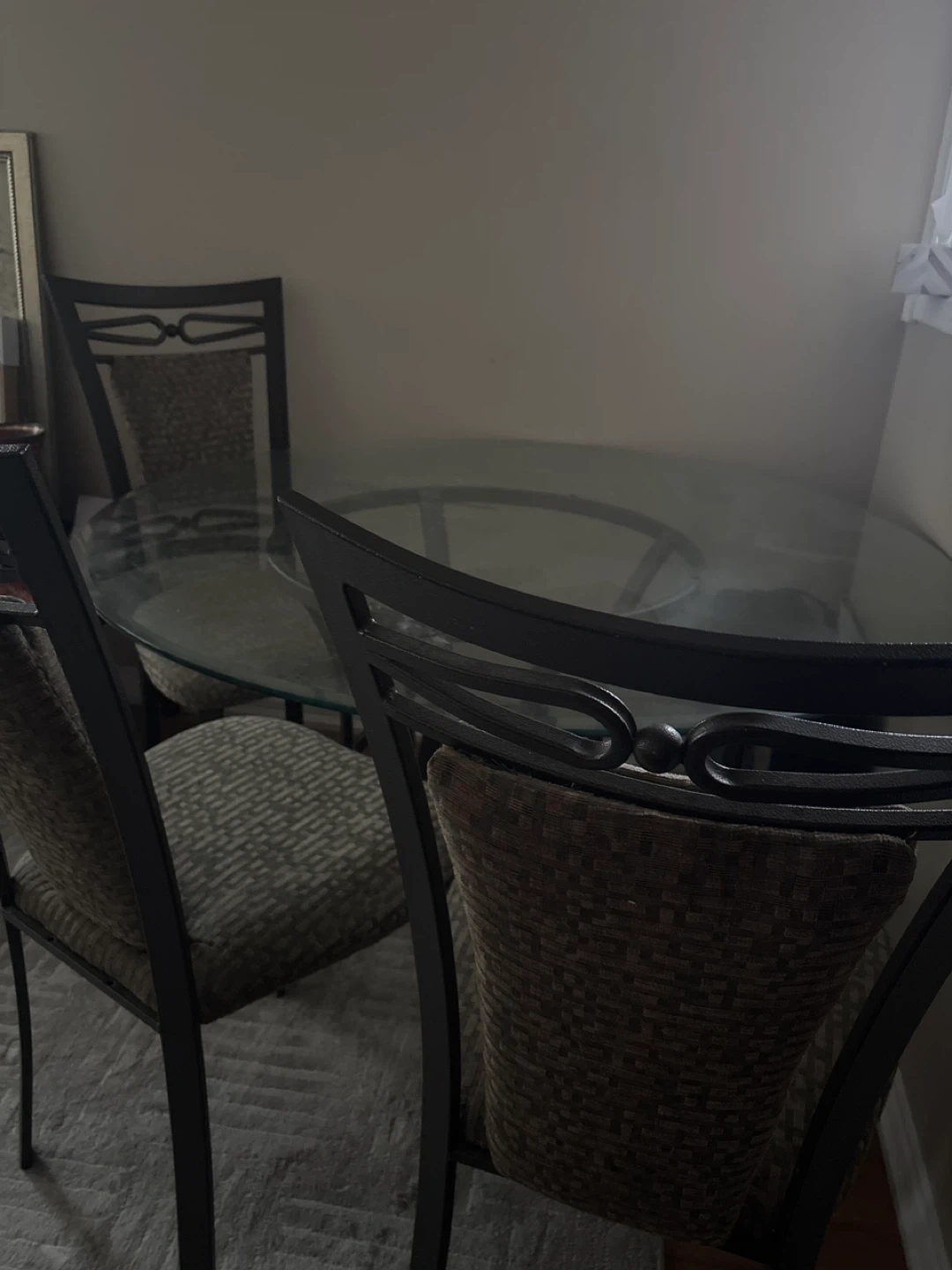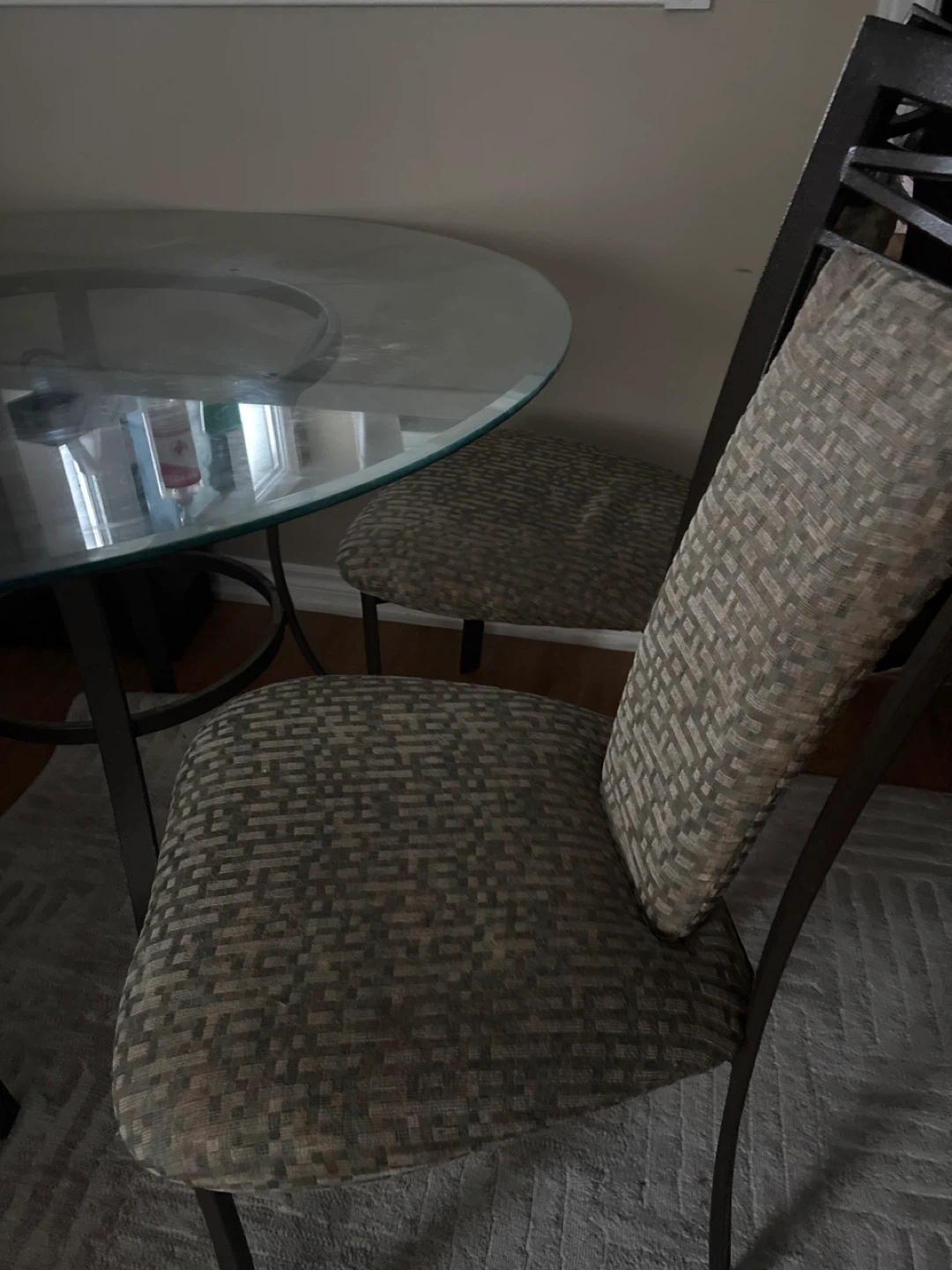 Selling a dining table with a glass top and four matching chairs. The chairs have a patterned fabric and metal frames. It's in good condition and ready for a new dining space!