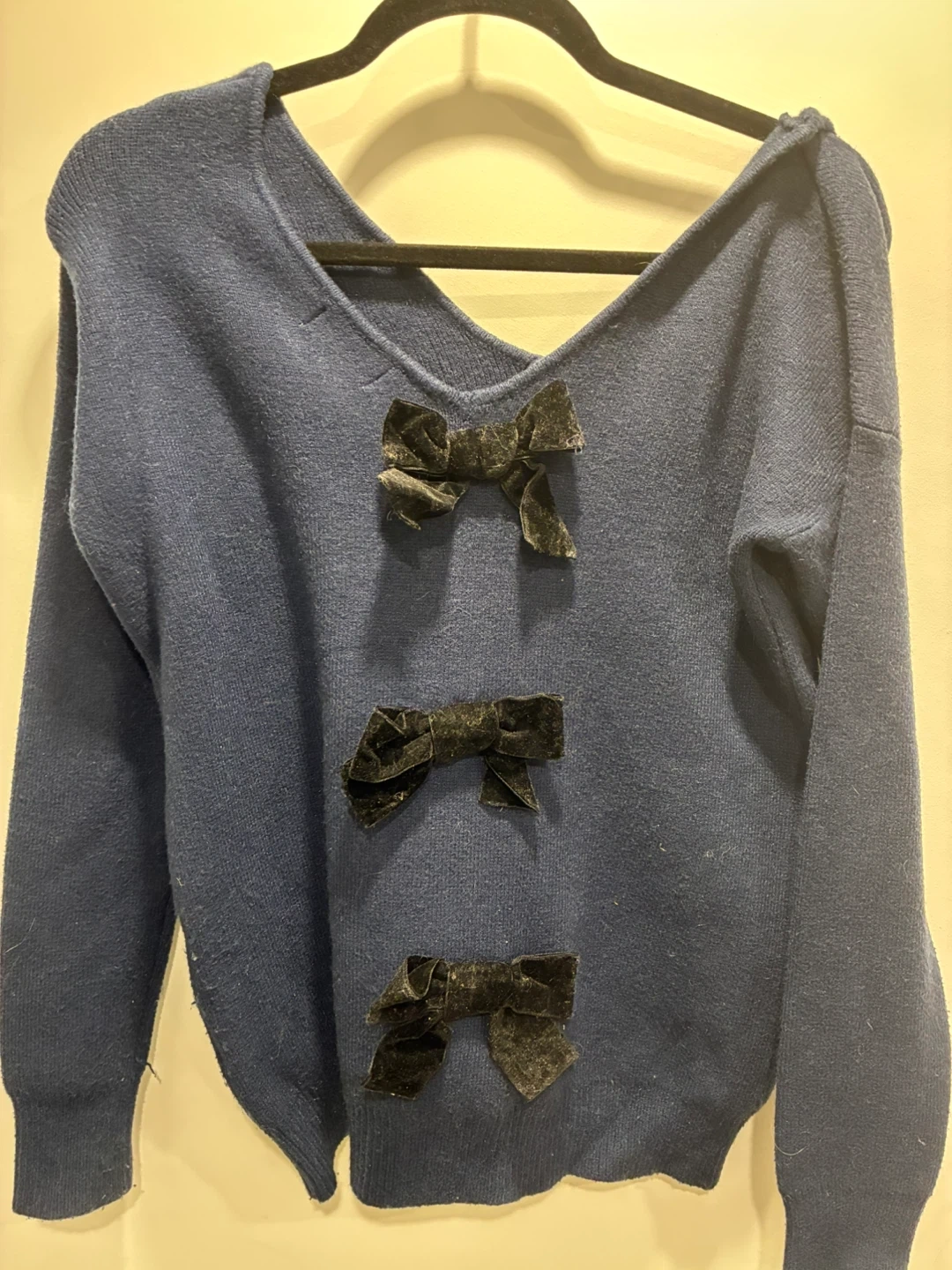 A cute navy blue sweater with a V-neck design! It features black velvet bows down the back. Perfect for adding a touch of charm to your wardrobe.