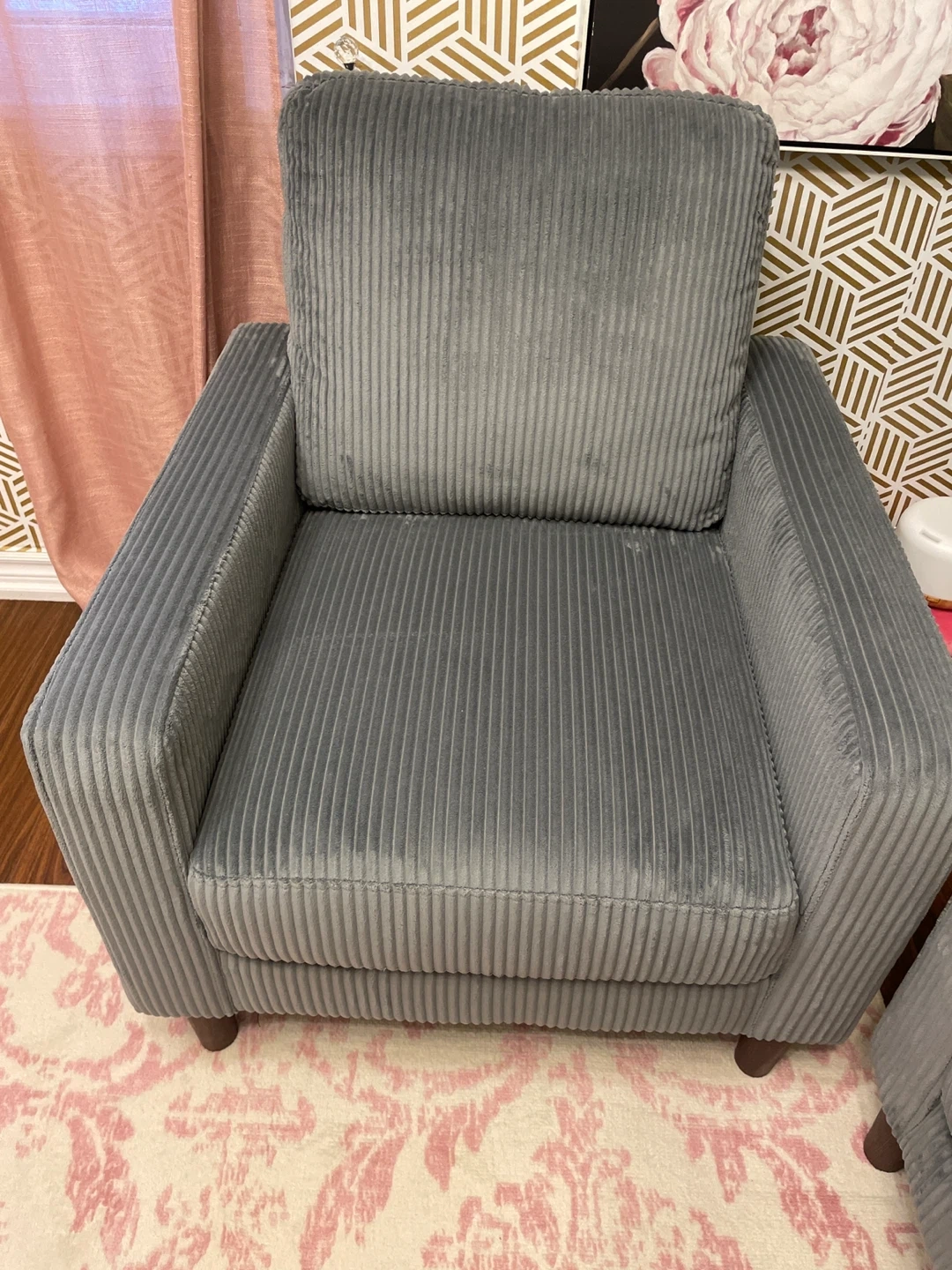 Sofa and matching armchair grey colour Silky soft seats velvety velour woven, élégant style comfy and durable posture Has beautiful brown colour wood legs 3 seats silky smooth comfy to relax enjoy your morning coffee ☕️ or evening cup of tea , it’s very elegant to have in your guest room for your guests