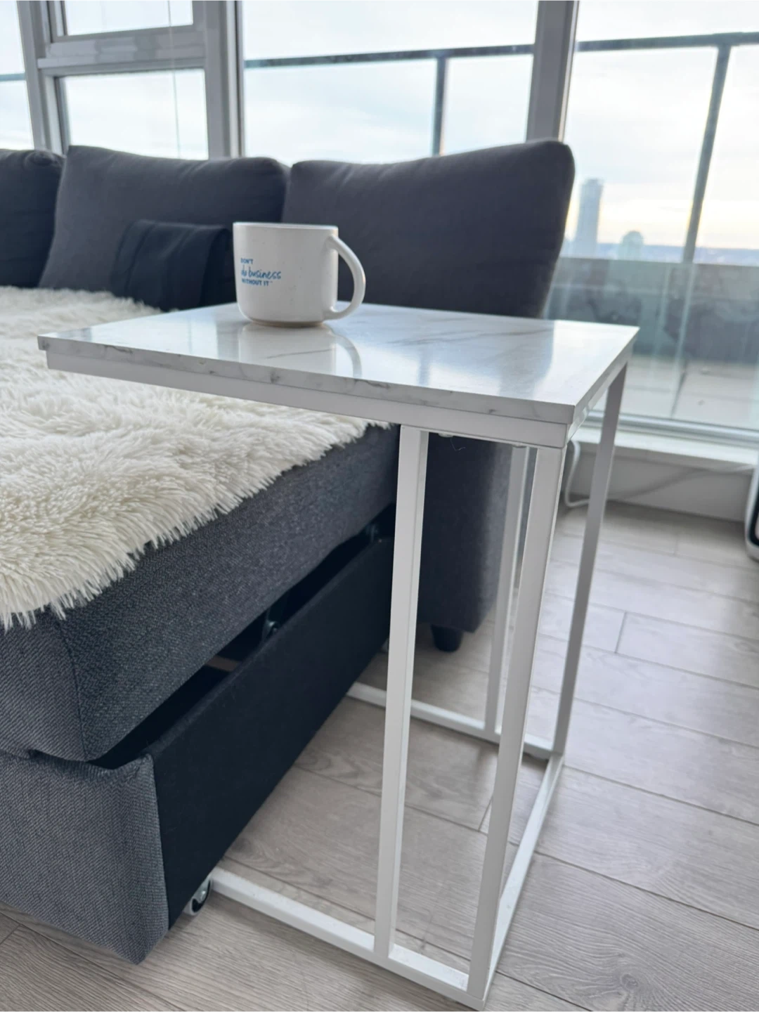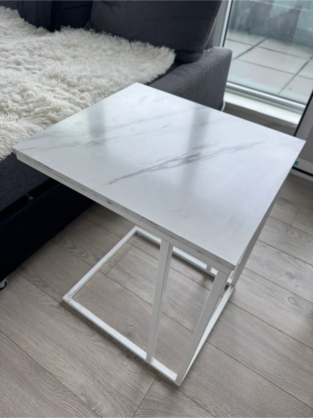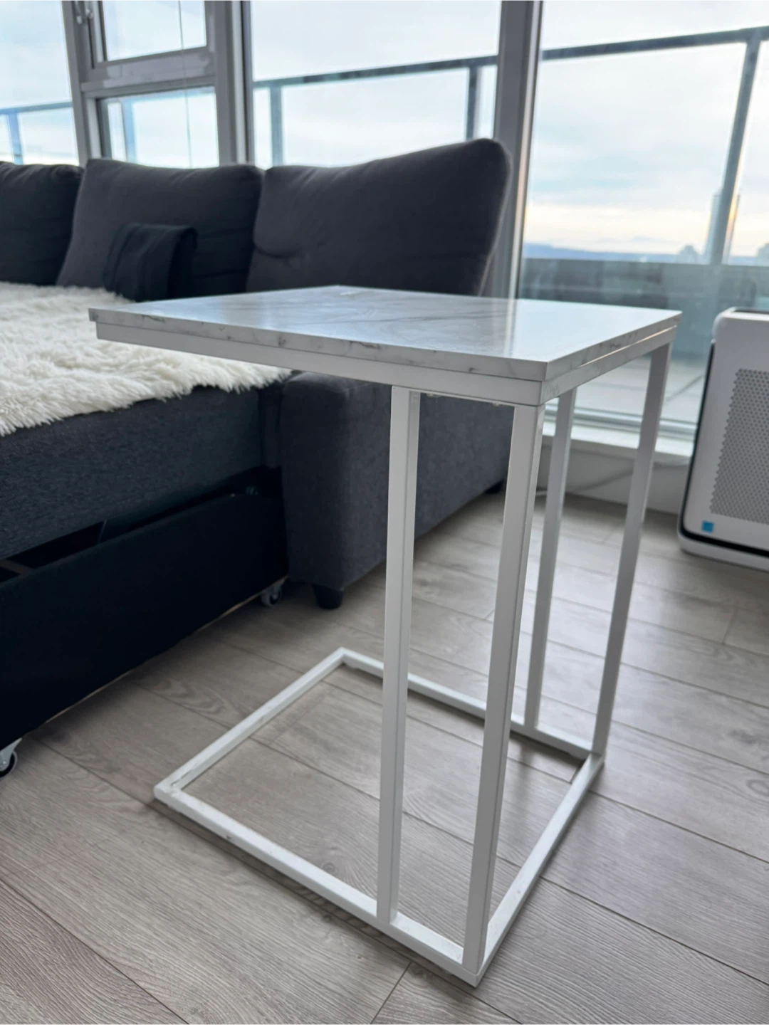 Selling a stylish C table with a white marble top and white frame. It's perfect for small spaces or as a side table next to a couch or bed. Great condition and very sturdy!