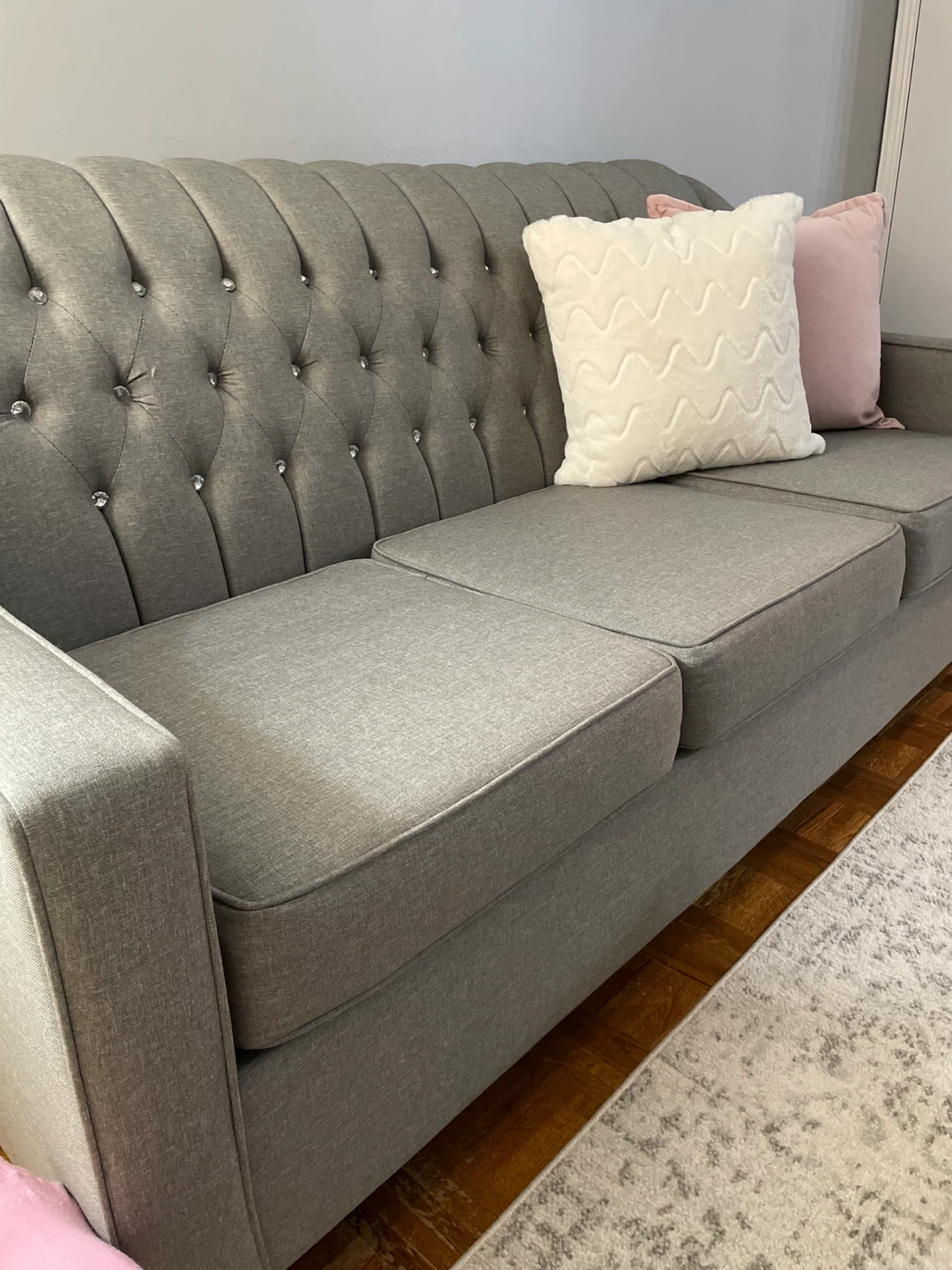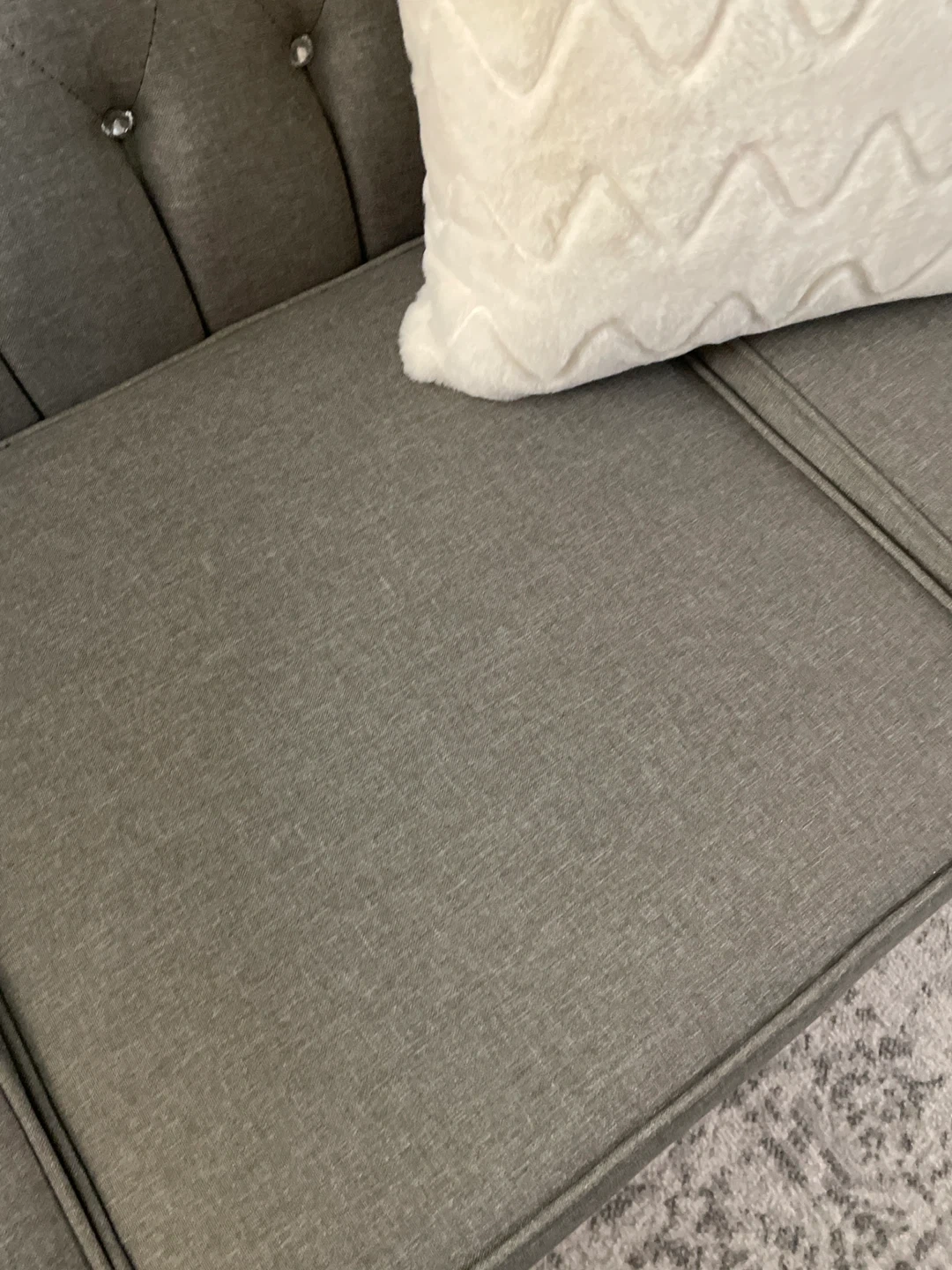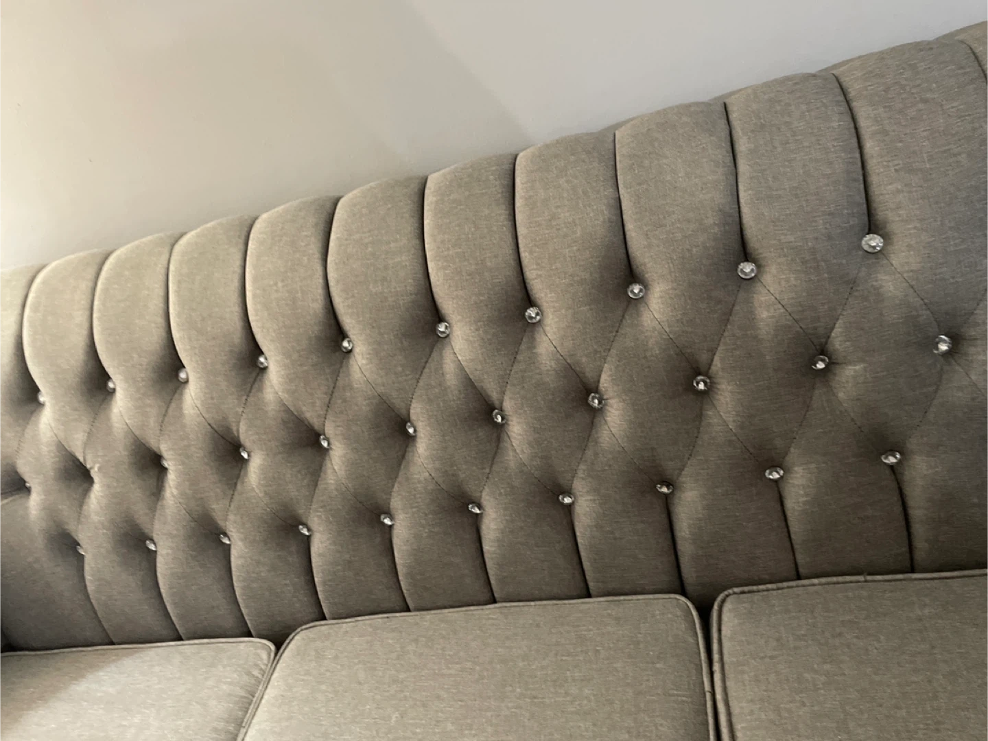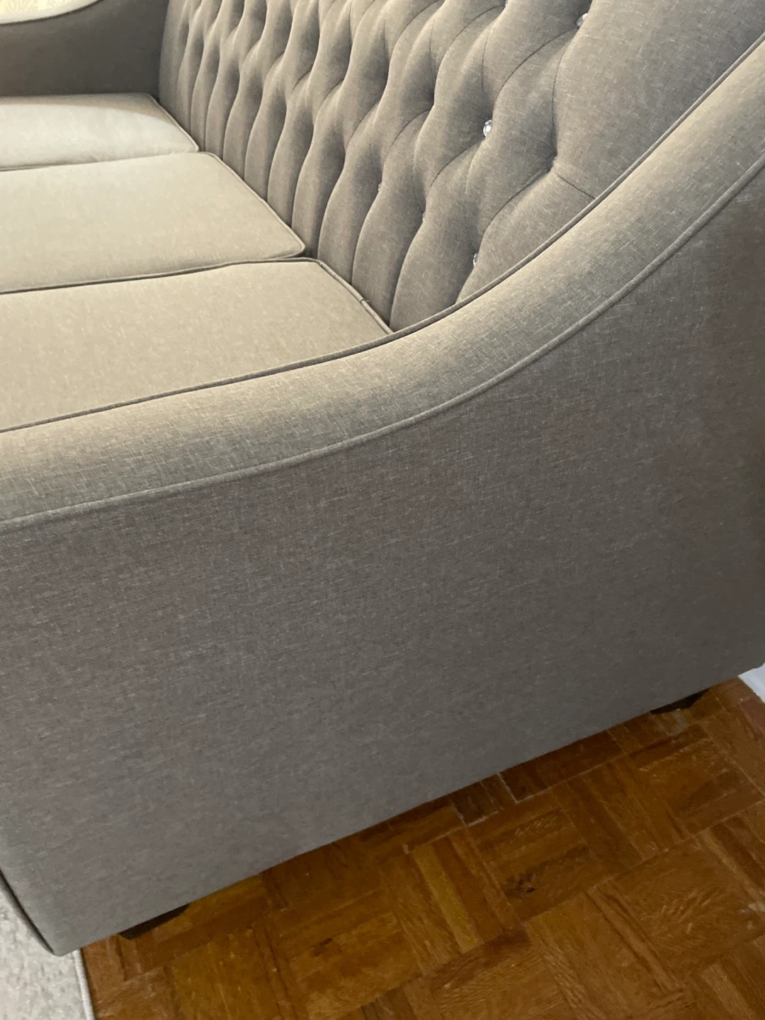 Grey colour sofa with detailing backing has diamonds buttons good quality material easy to clean to take care of it , seats are in excellent great shape , durable and modern style excellent condition posture no scratches no damages it’s very welcoming furniture looks fantastic in any living room or guest room The fabric is durable and the design is classic. Ready for a new home! Don’t miss it
