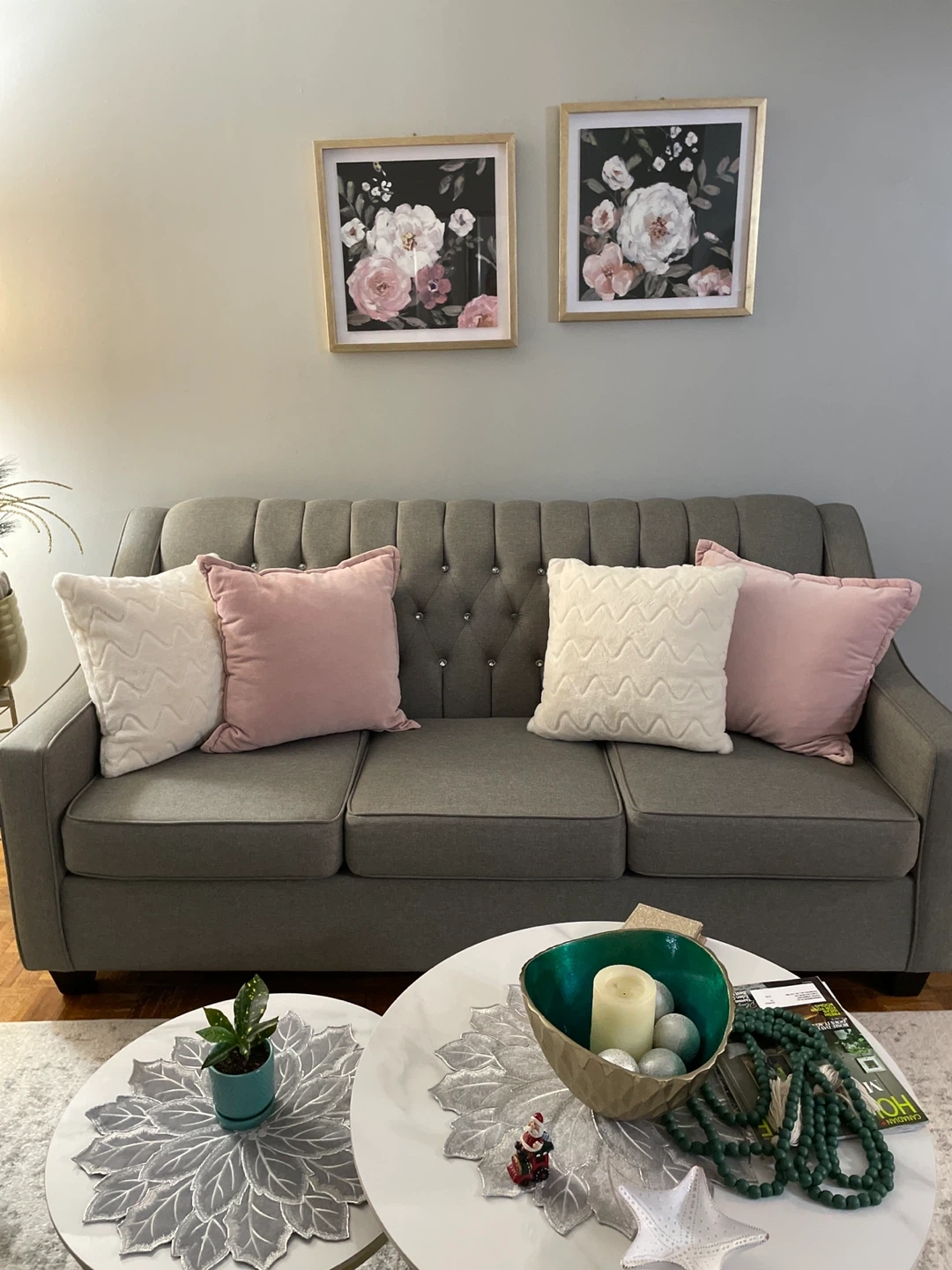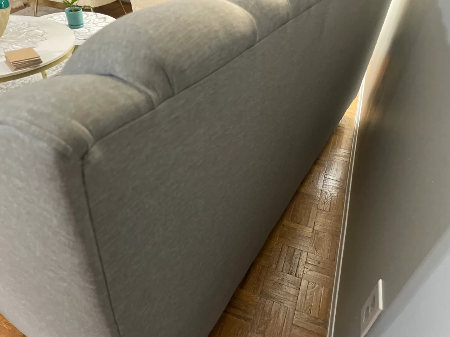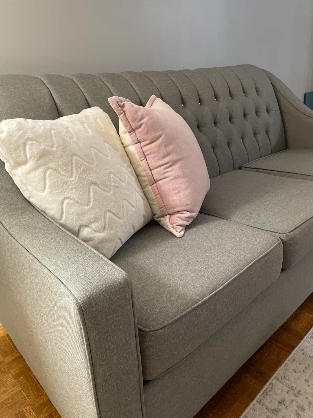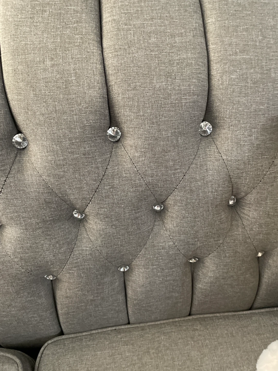 Grey colour sofa with detailing backing has diamonds buttons good quality material easy to clean to take care of it , seats are in excellent great shape , durable and modern style excellent condition posture no scratches no damages it’s very welcoming furniture looks fantastic in any living room or guest room The fabric is durable and the design is classic. Ready for a new home! Don’t miss it