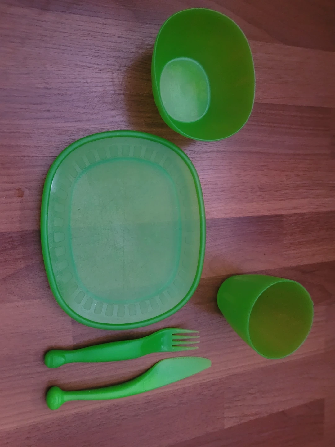 This cute green toddler dish set is perfect for little ones learning to feed themselves; the set is in used condition but ready for its next family.