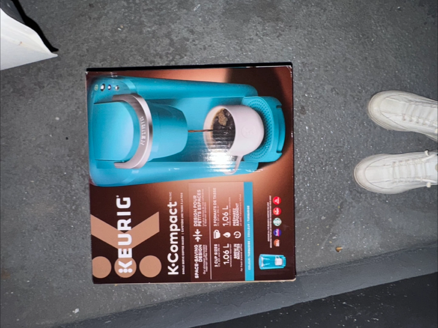Selling a Keurig K-Compact single serve coffee maker in a lovely turquoise colour! This space-saving design is perfect for smaller kitchens. It brews in under a minute and can make 3 different cup sizes using its 1.06L removable reservoir