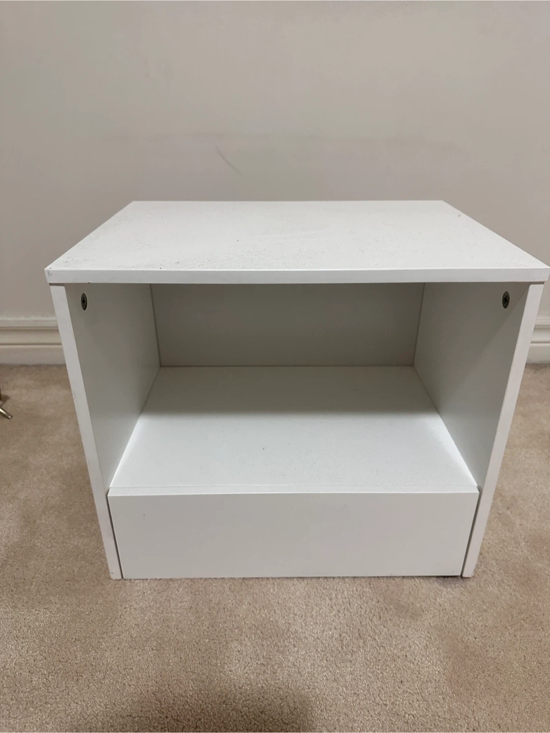 Selling a simple white bedside table! It has a drawer for storage and an open shelf. Perfect for keeping your essentials close by while you sleep! I have two of them and can sell both for 25$