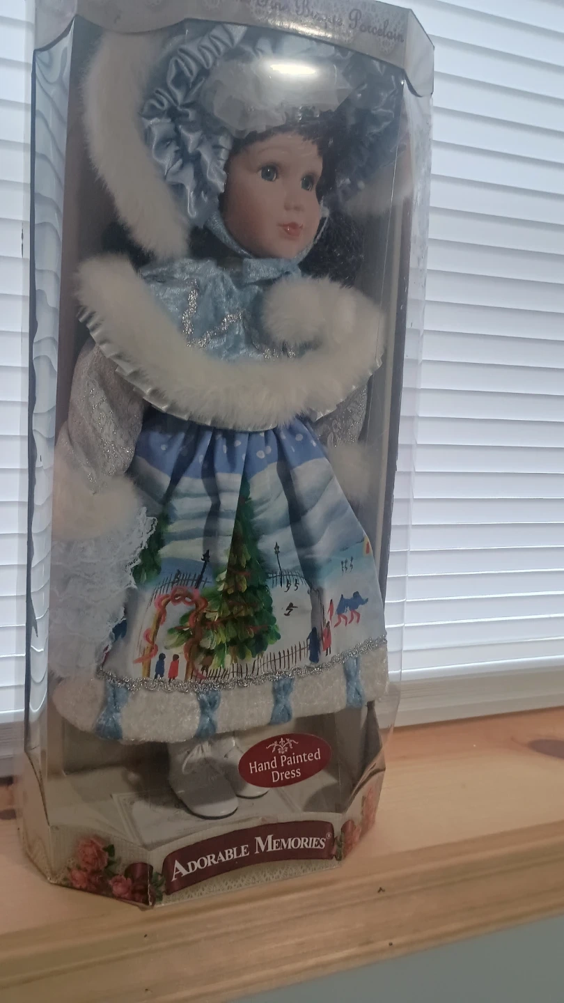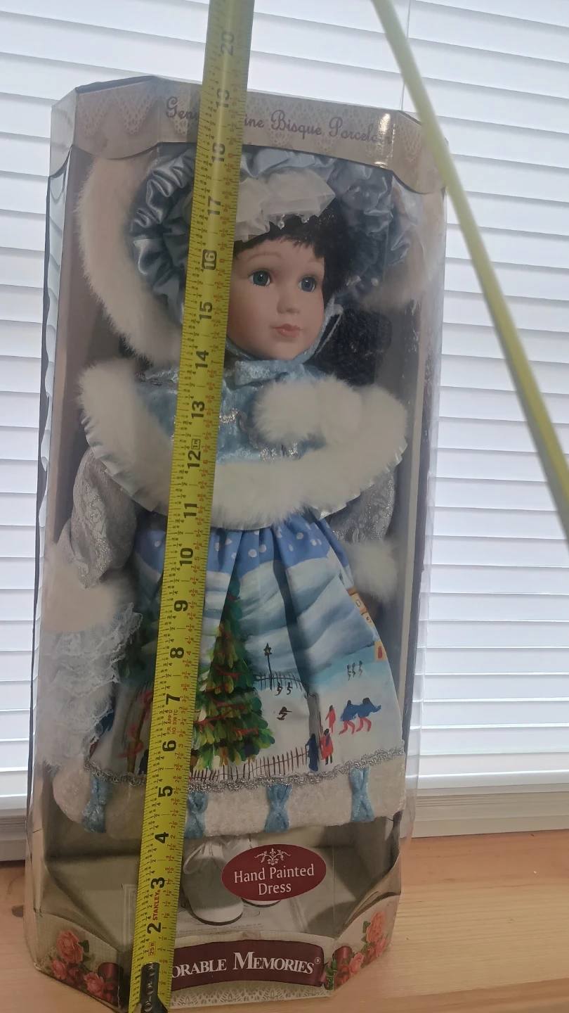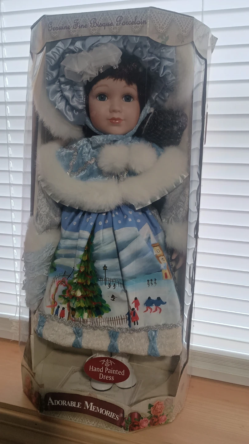 Adorable Memories bisque porcelain doll in original box. The doll has a hand-painted dress. The box measures approximately 16 inches tall.