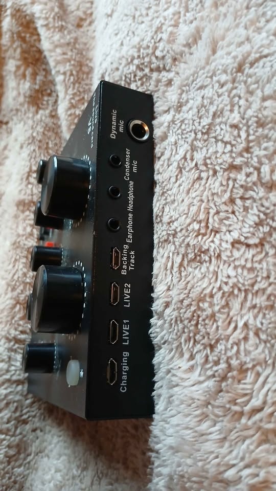 Controls: Knobs for mic volume, echo, bass, treble, music volume, and monitoring.