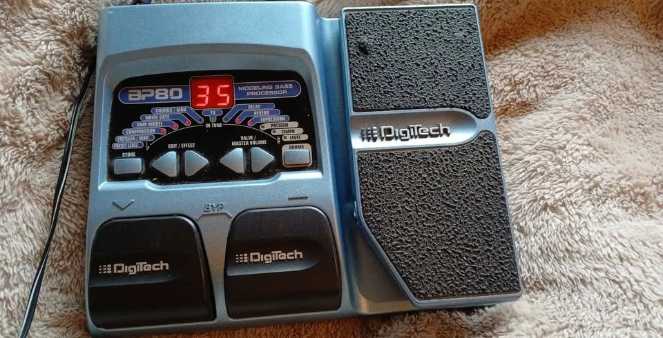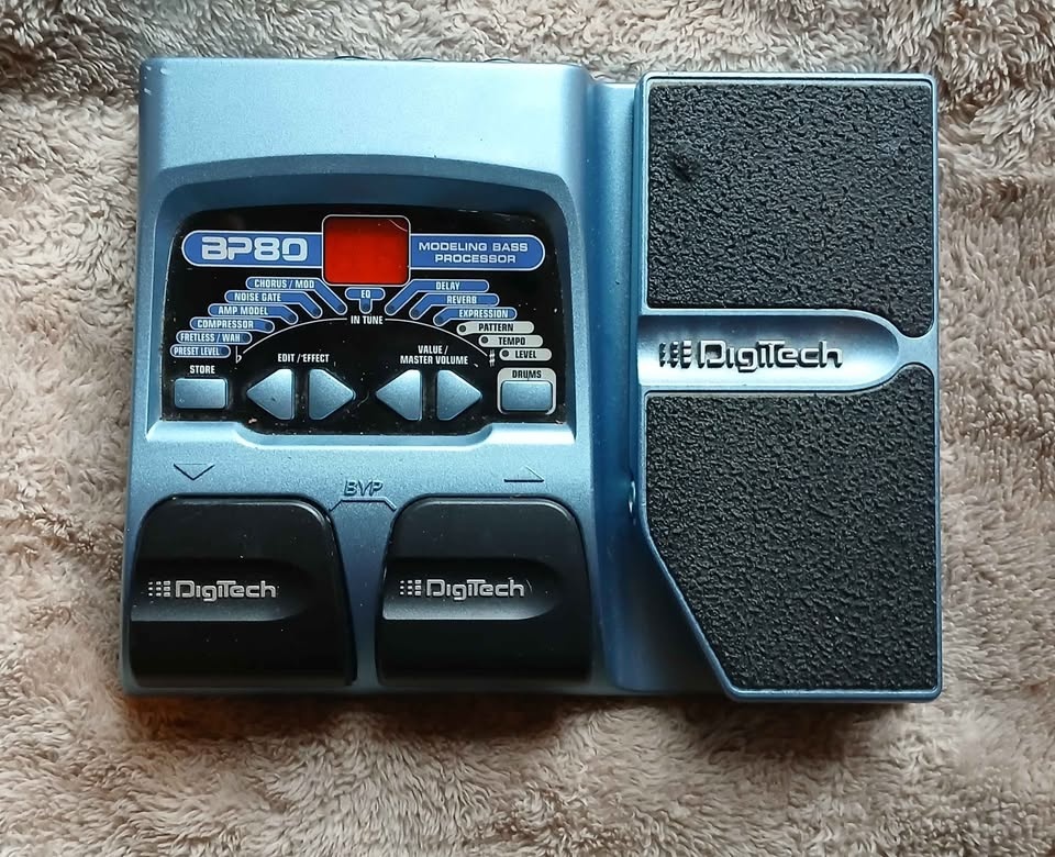 Digitech BP80 - bass guitar multi-effects pedal featuring amp modeling, stompbox effects, an expression pedal, drum machine, and tuner, powered by DigiTech's AudioDNA DSP for creating diverse tones with 16 amp/stomp models and 40 factory/user presets