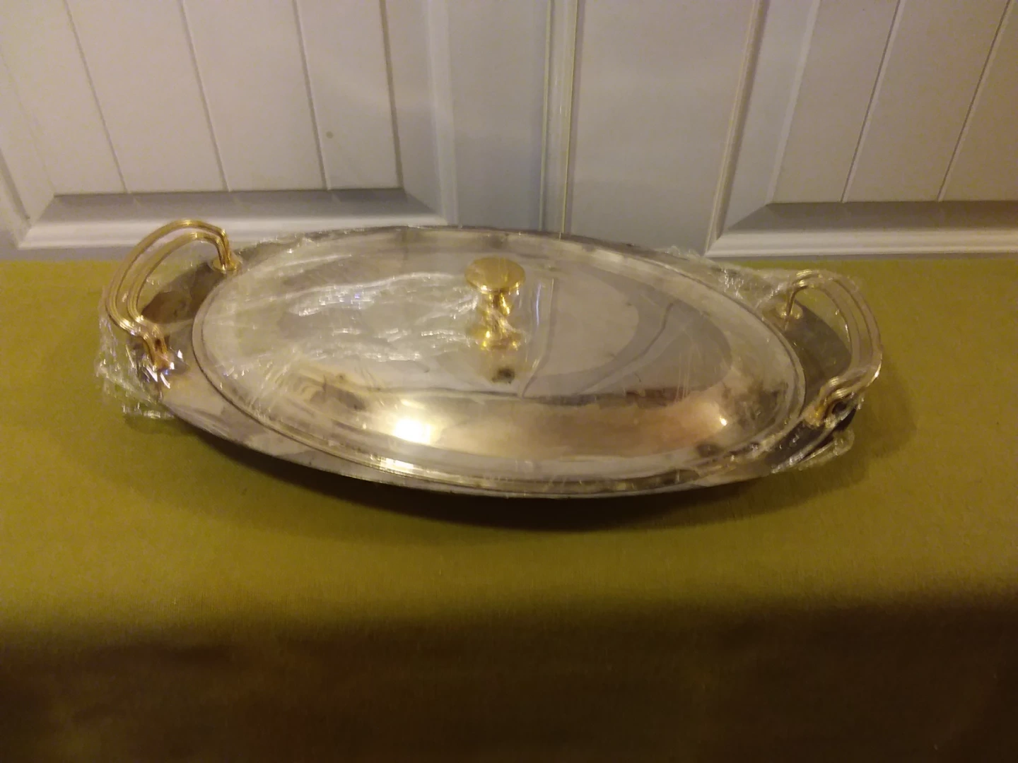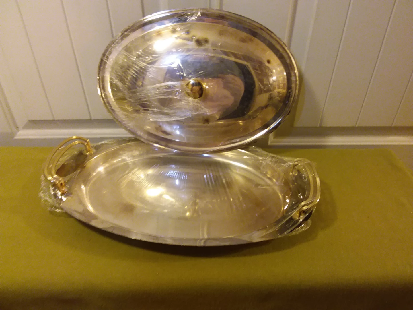 Selling a ➡️ 925 ⬅️ Silver - Plated Oblong Serving Platter w / Lid, and Gold Handles 🥣