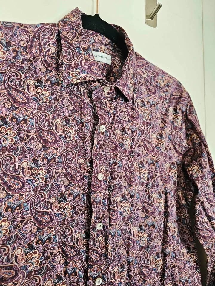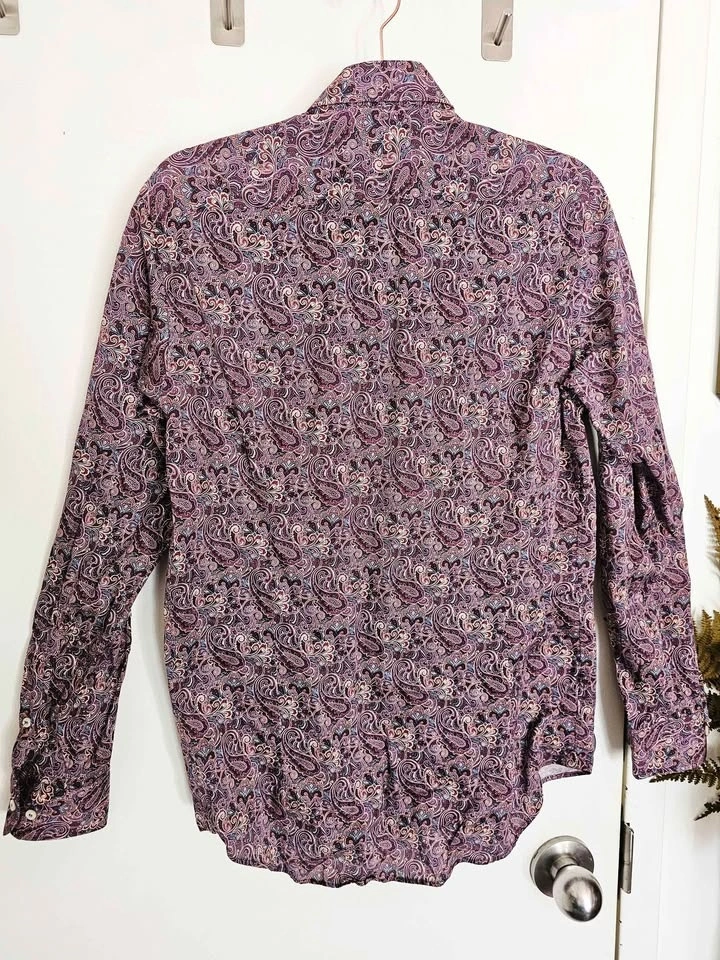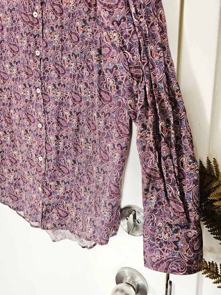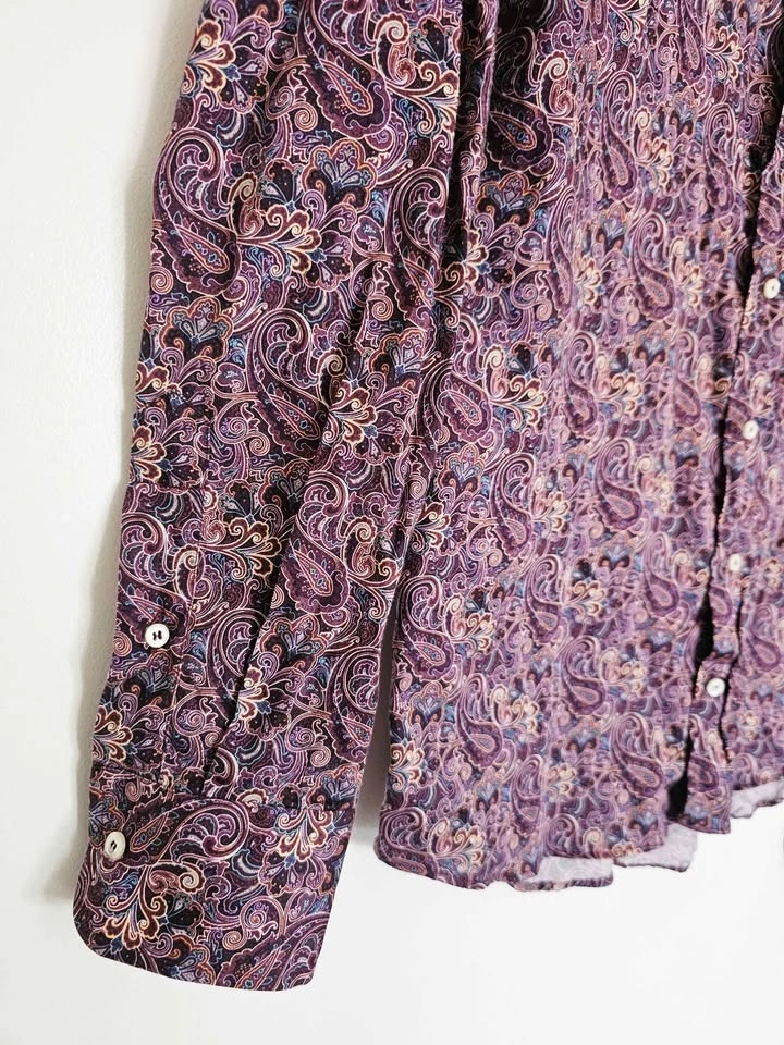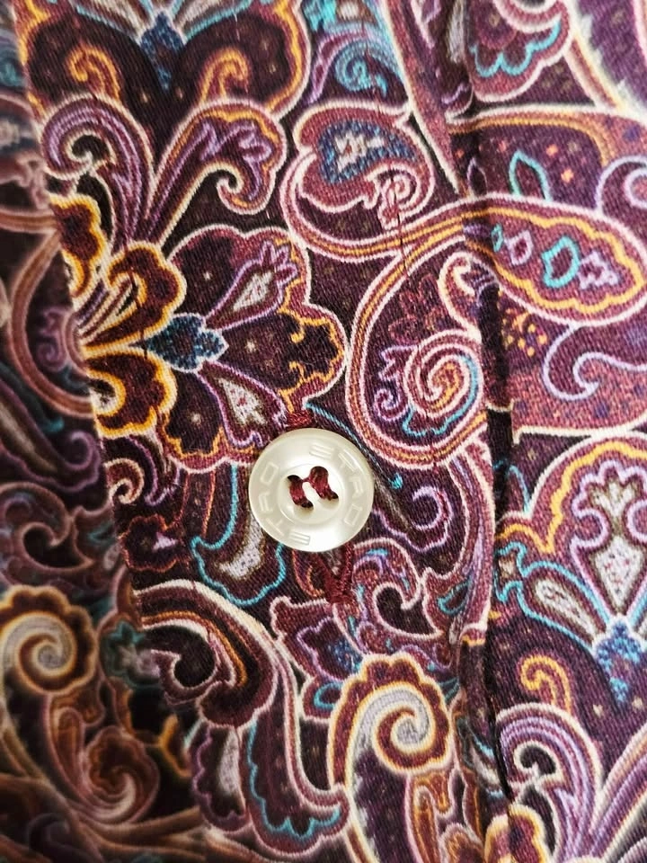 Authentic Etro Milano long-sleeve button down luxury designer men's shirt featuring an intricate paisley print in rich purple, plum, teal, and golden yellow tones. Crafted in Italy from high quality breathable 100% cotton.