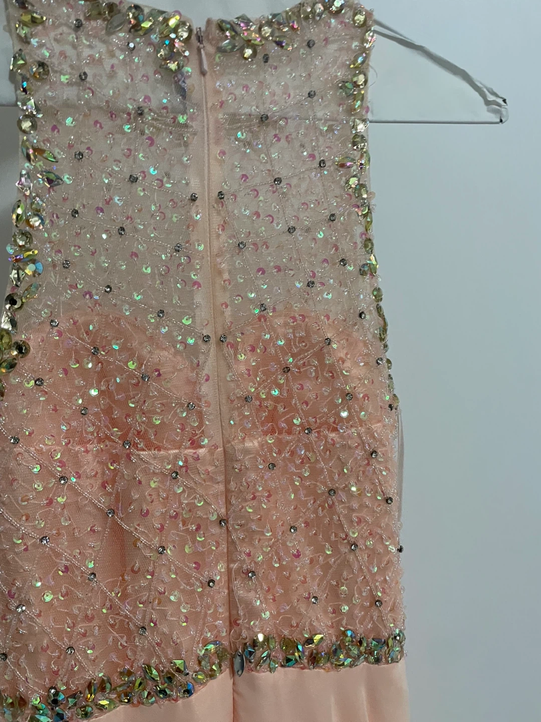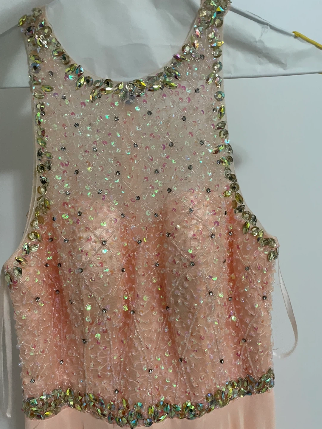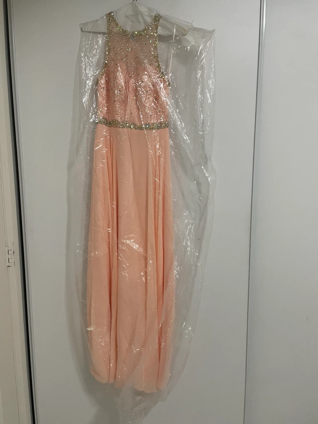 Selling a beautiful peach-coloured formal dress! It has a beaded top and waistline, adding a touch of sparkle. Perfect for a special occasion!