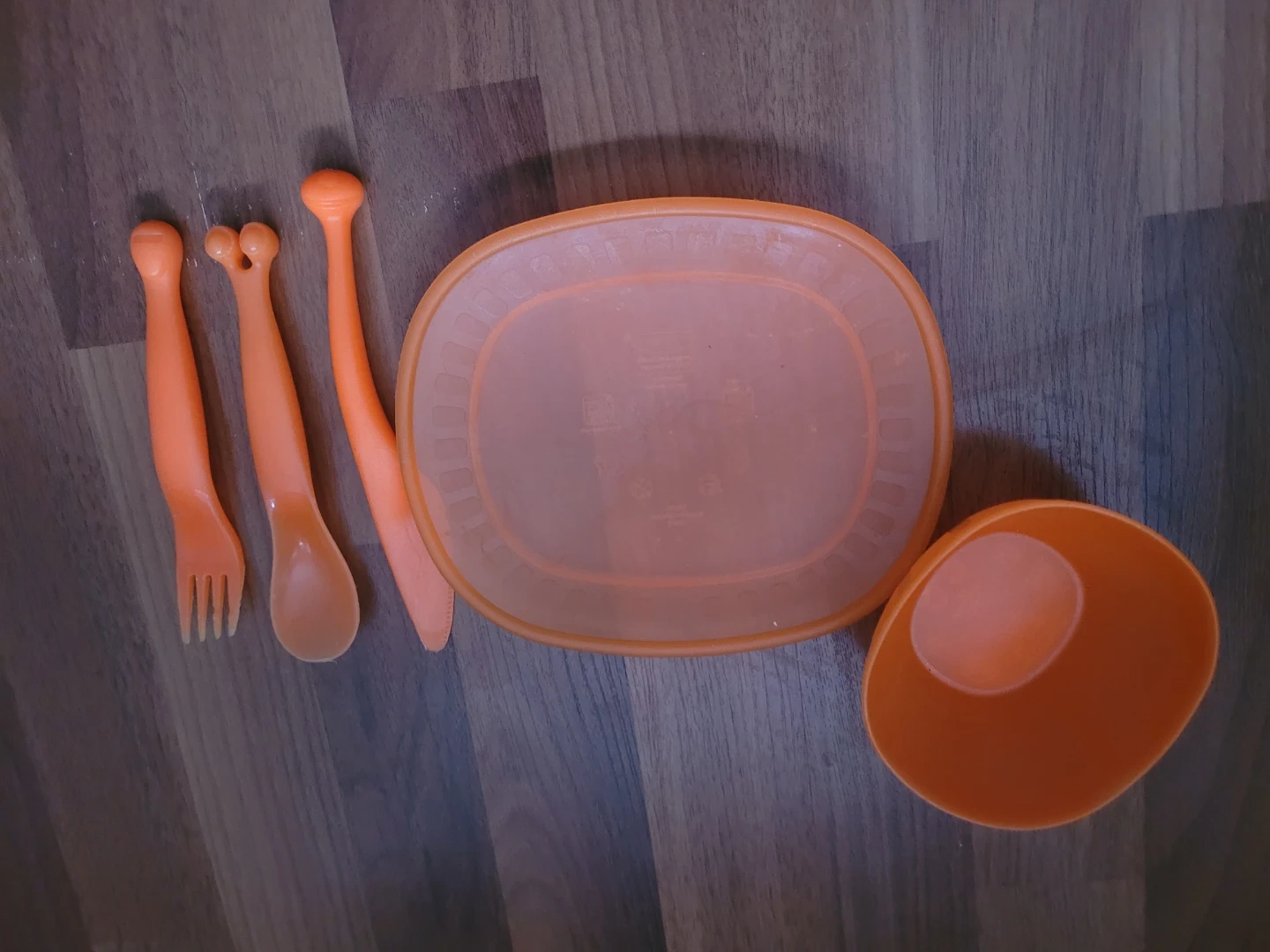 This adorable toddler dish set includes a plate, bowl, spoon, fork and knife, perfect for starting solids! These items have been previously enjoyed and are in good condition, ready for your little one's mealtime adventures.