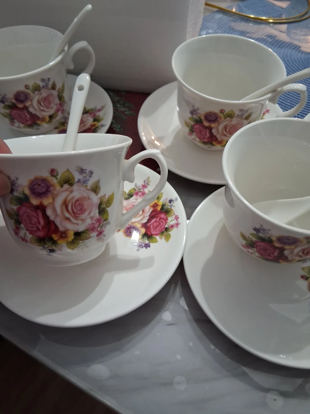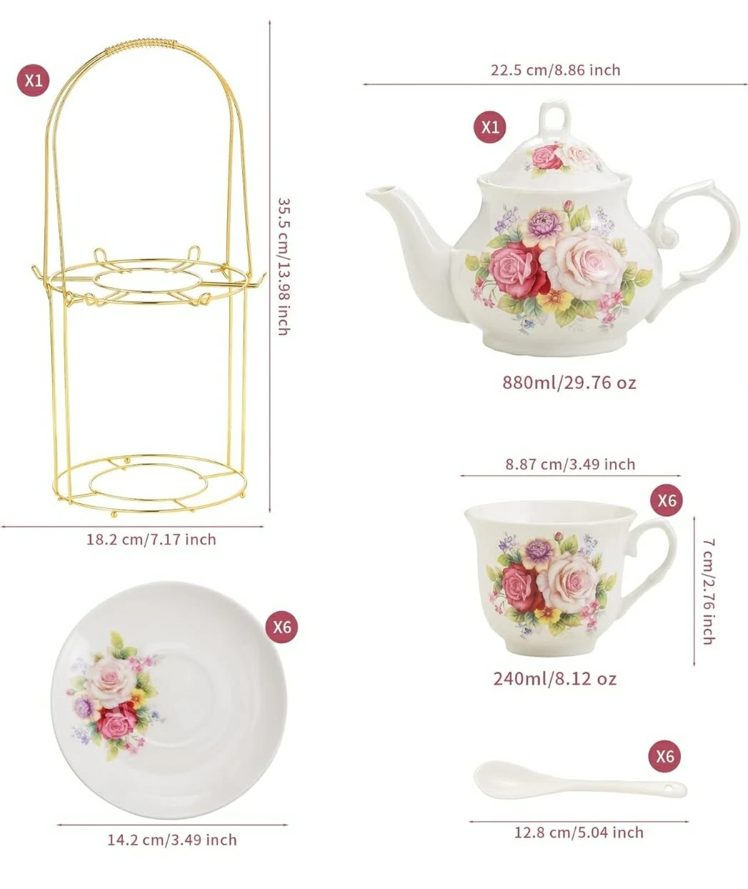I'm selling a beautiful floral tea set. It includes a teapot, six cups, six saucers, and six spoons. The set also comes with a gold-colored metal stand for display. The teapot holds approximately 29.76 oz, and each cup holds about 8.12 oz. The cups are decorated with a lovely floral design. Perfect for tea parties or adding a touch of elegance to your home!